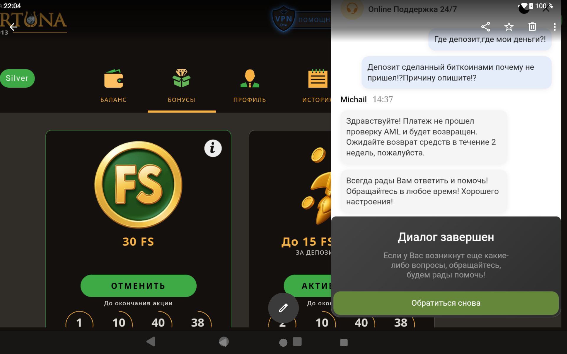 В поддержке тупо замят и закрывают диалог не давая в принципе никакие ответы!!!Безусловно,ПФ подняла уровень работы,крутое меню,максимальное количество слотов,все это Факт!За это Респект!Только выиграть ни в один слот также невозможно!!!Да ещё и придумали фича с уморозкой криптоденег на 14-20дней!!!Которыми они очень замечательно так пользуются по своему усмотрению.