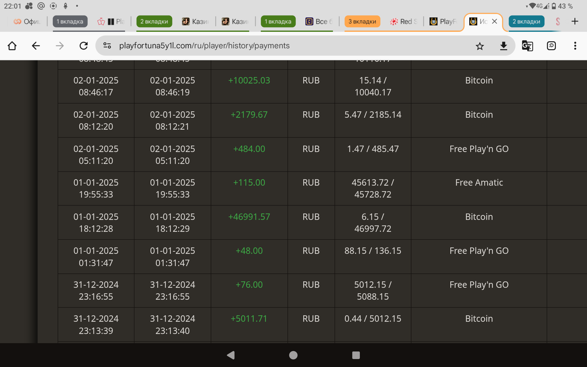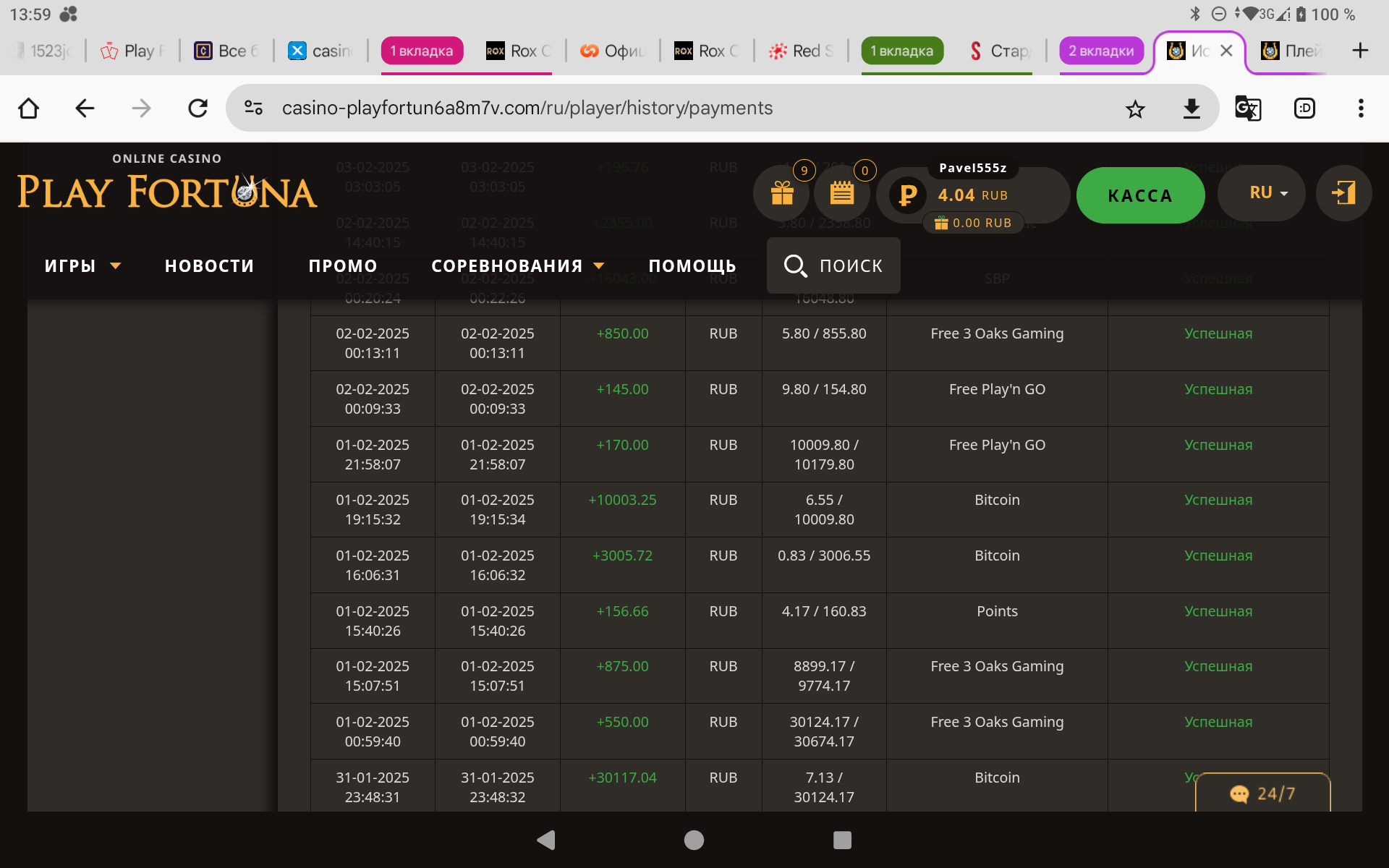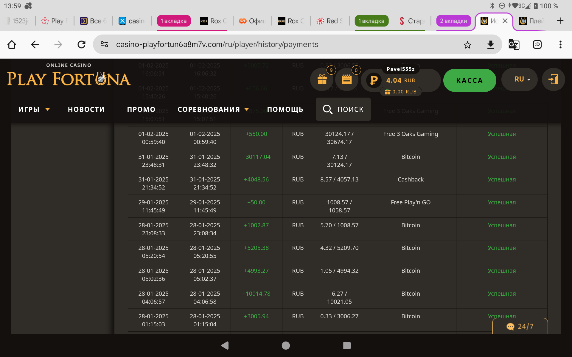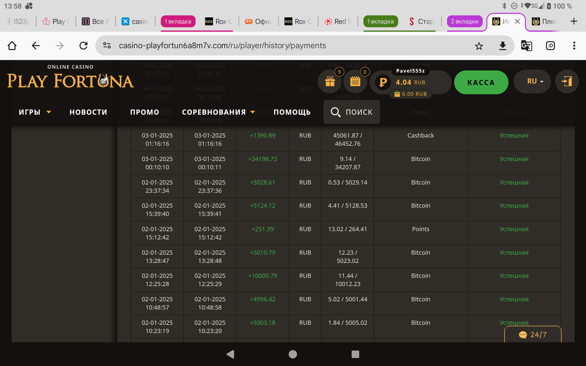 Депозит сделан 1января и тогда же он поступил на кошелек плей фортуны(в бы все видноя сумма есть на кошельке и поступила она минут за пять туда) однако сумму не закинули на баланс самого казино. В ТП взяли хэш и отправили на проверку в фин отдел, которая до сих пор идёт.