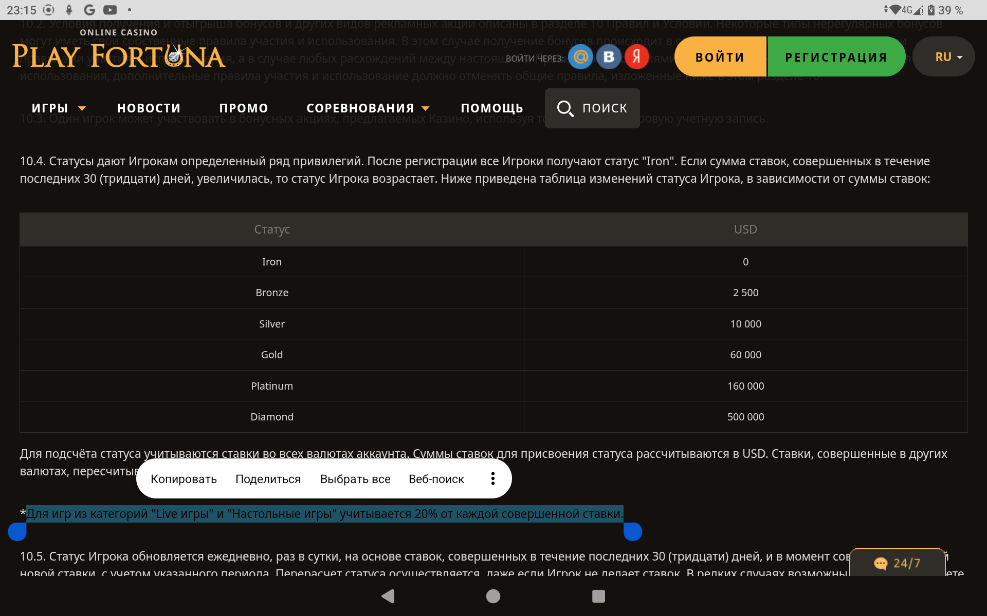Что сможете ответить по поводу развития статуса игрока?!Согласитесь,это Абсурд!Вы грамотно проработали функционал ,удобно стало видеть шкалу открутки бонусных очень,просто Отлично,шкалу развития статуса также(Но сам Статус нуу просто теперь Невозможно Развить!!И это длится уже больше Год!!!Я обратил на это внимание летом еще.Причем примечание,что 20% при игре почему то в так называемый лайв🤣🤔(который по отдаче хуже чем слоты ваши ,которые перестали вообще играть) учитываются в счёт открутки от сделанных ставок,Вы ввели как это говорят,по тихой грусти,то есть втихомолку. Вы знает,как например депаю и играю Лично я,давайте тогда на моем примере это разберём и рассмотрим,так что ,Вы хотите сказать,при моих депозитах уже от 30,50 тысяч за раз ,при ставках от 5-20-20 тысяч рублей временами за спин,как это делаю я,как Вы знаете, я обычный игрок?!
