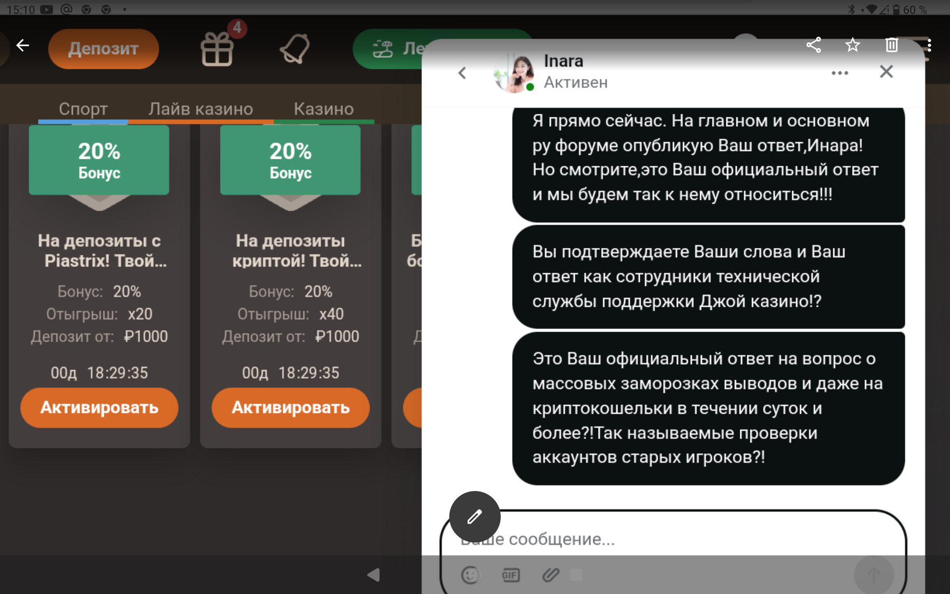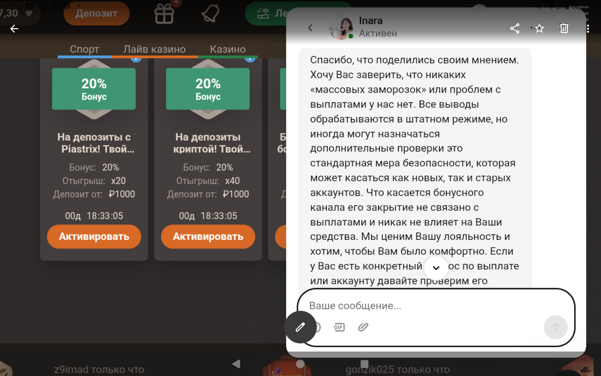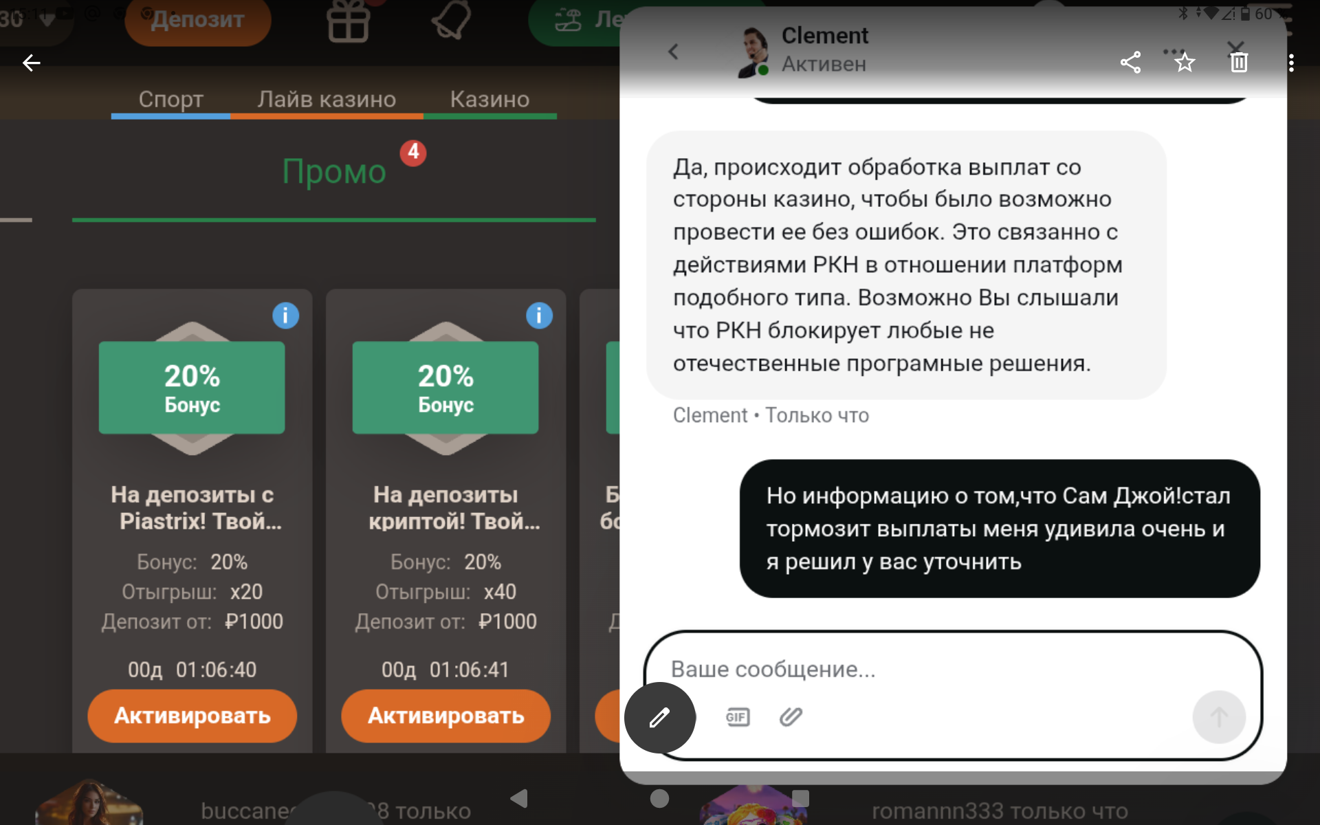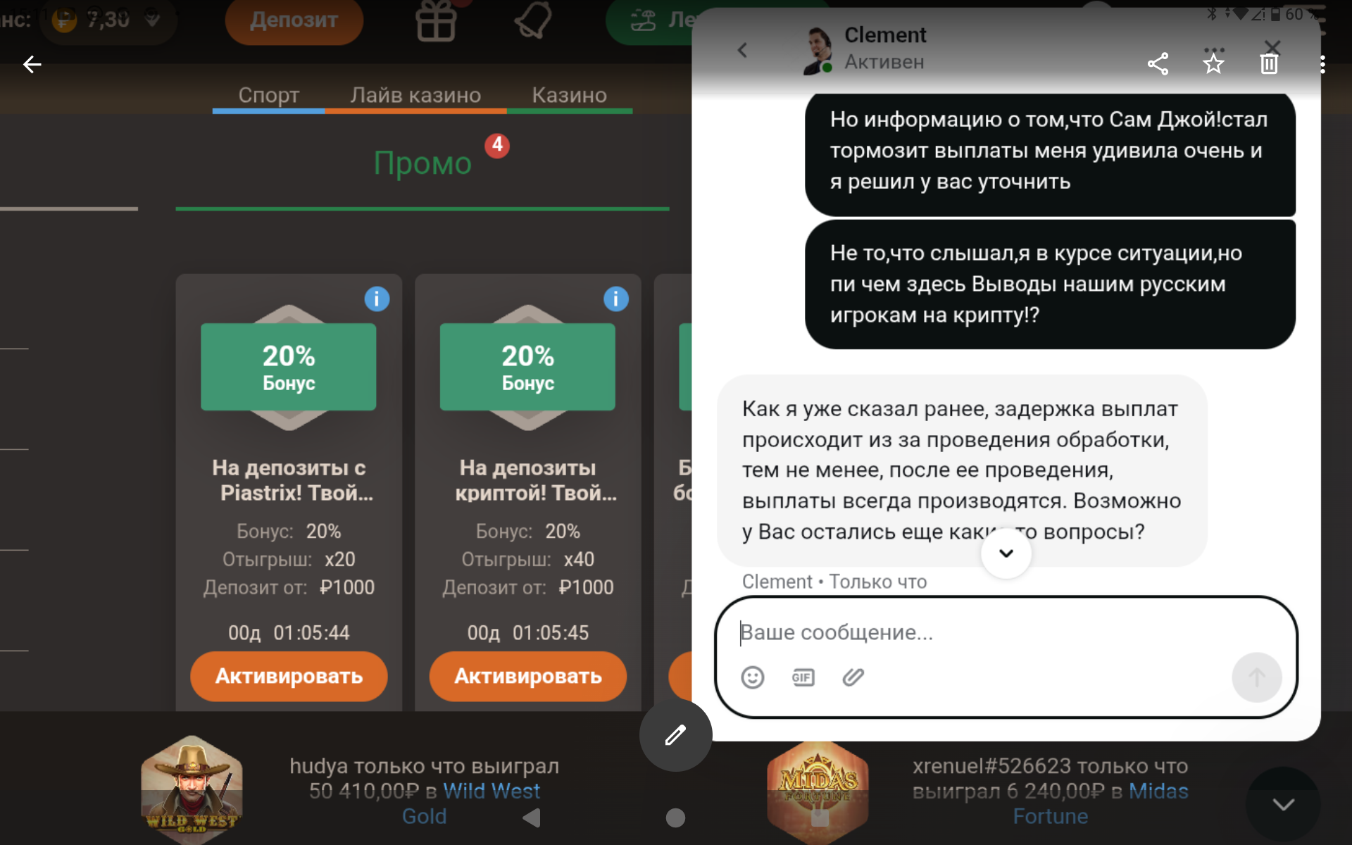 Раньше на любом их проекте вывод на Пиастру в большинстве случаев был от моментального до 15 минут, а на крипту от 10 минут до часа максимум, но вот последний месяц вывод на крипту ( и на пиастру скорее всего тоже ) стал идти минимум 3 часа, а сейчас уже жалобы идут что идёт сутками и тоже самое в их группах и представитель в жалобах отвечает что идёт проверка аккаунта, но как по мне враньё полное, ибо раньше вообще жалоб на их вывод не было, а сейчас жалоб очень много и якобы у всех проверка аккаунта, ну да.