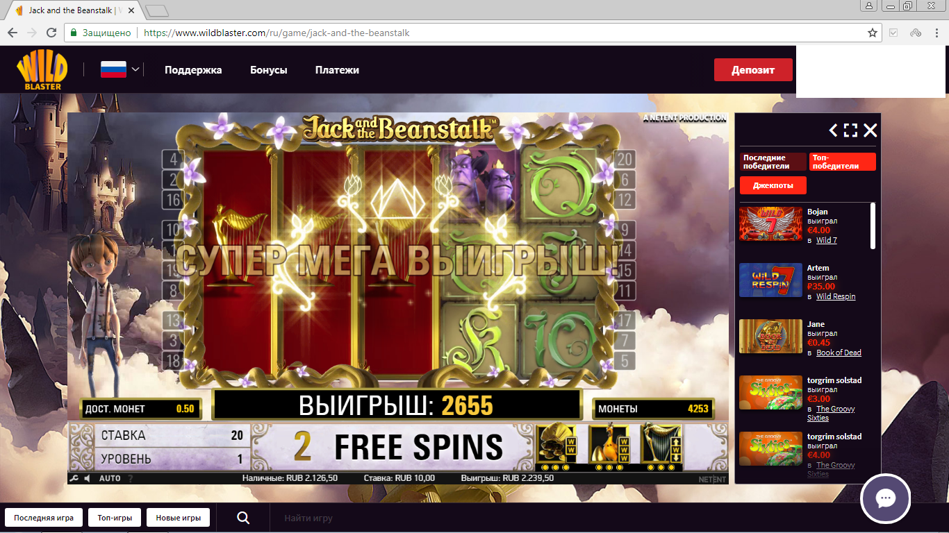 Wildblaster Casino Поймала в Jack and the Beanstalk 3 арфы по 10руб. и в итоге х260😮