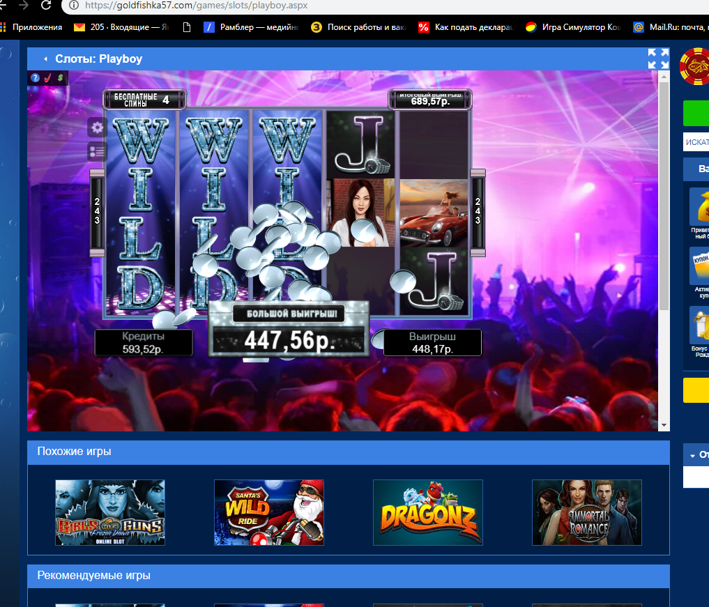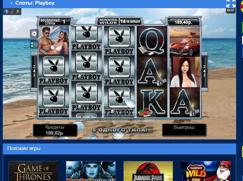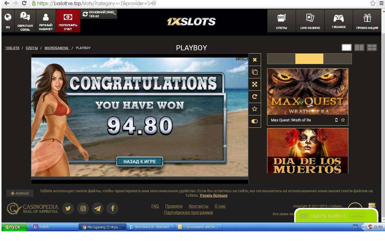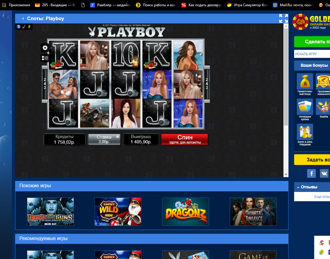 Отыгрывая бонус в новом казино в слоте «ПлейБой» получалось встречать выигрыши более Х100 только при ставке 30коп(а 60коп 90 120 180 были лишь слезы) Наверно просто не повезло… 😎