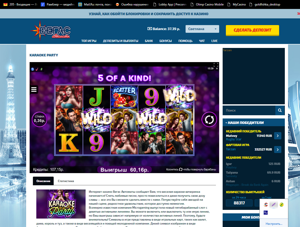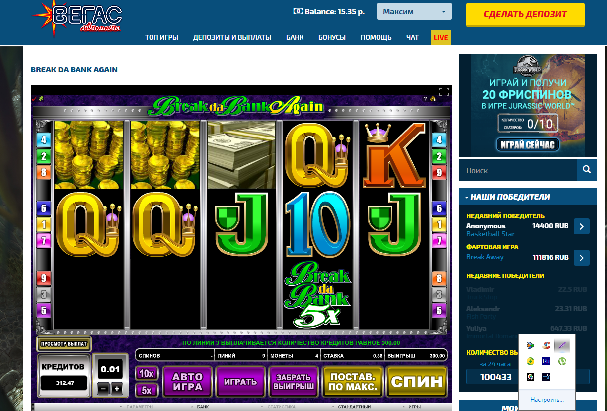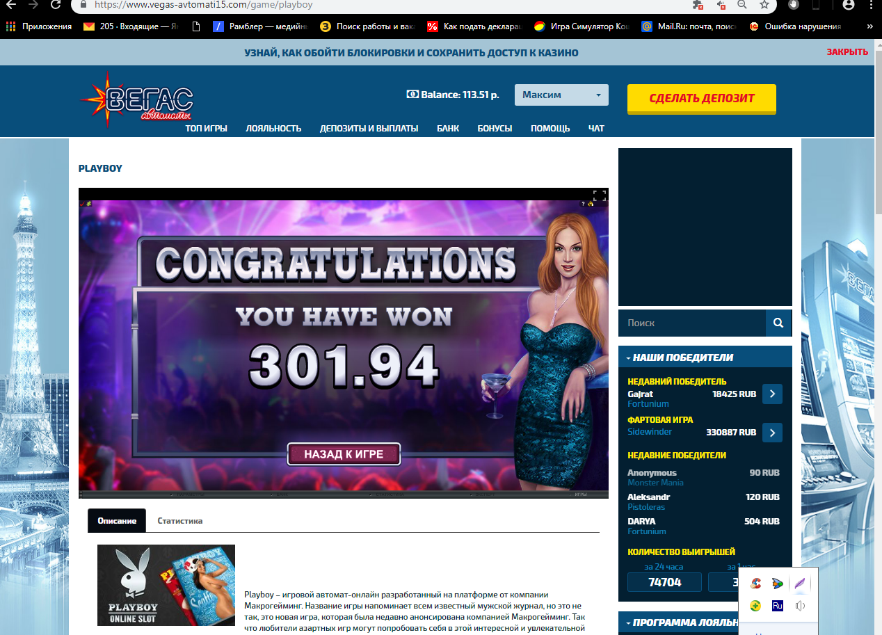 Отыгрывая бонус в новом казино в слоте «ПлейБой» получалось встречать выигрыши более Х100 только при ставке 30коп(а 60коп 90 120 180 были лишь слезы) Наверно просто не повезло… 😎
