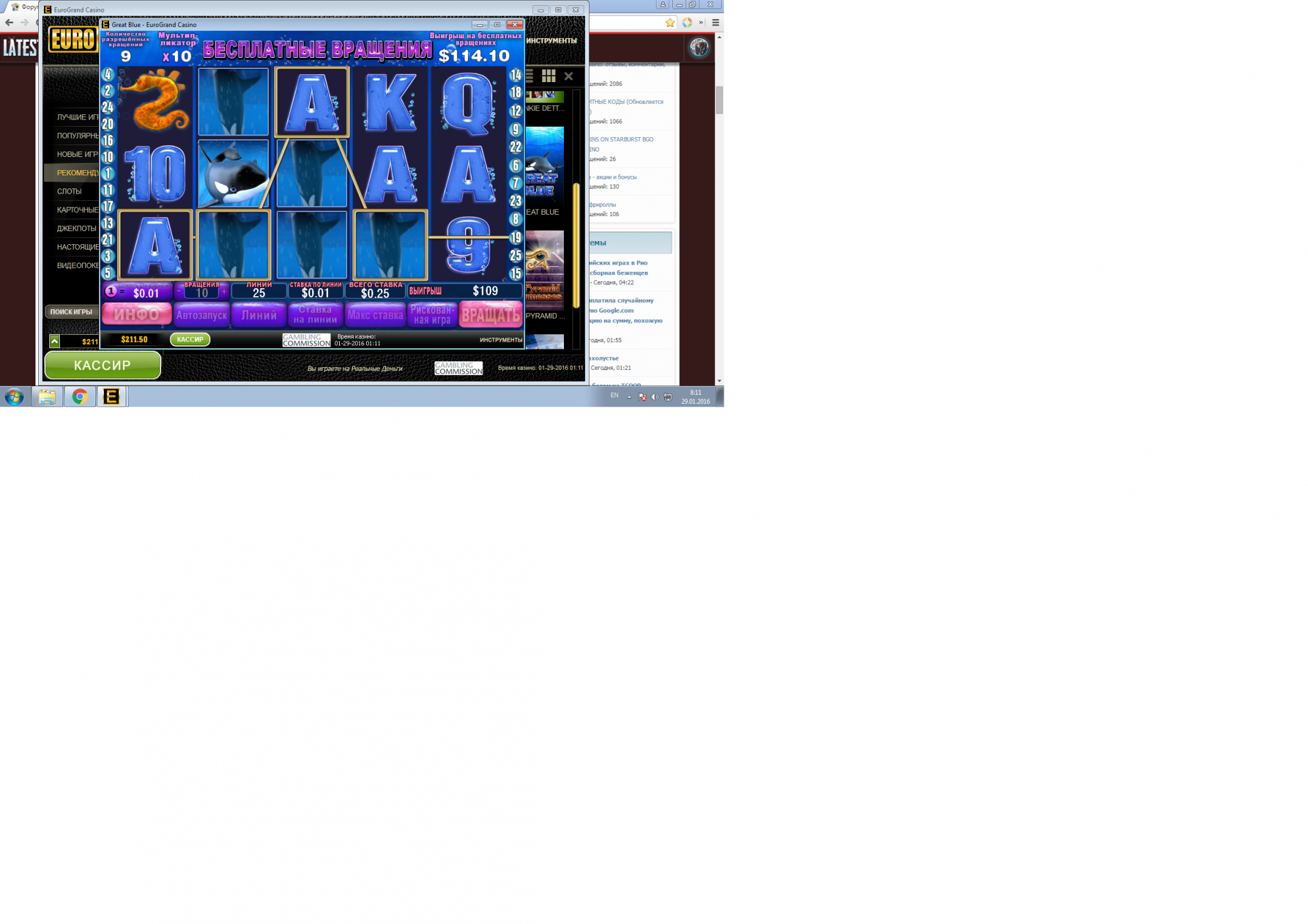 Там же видно деноминацию — 0.01)), общий выигрыш 28к. — 280р.
