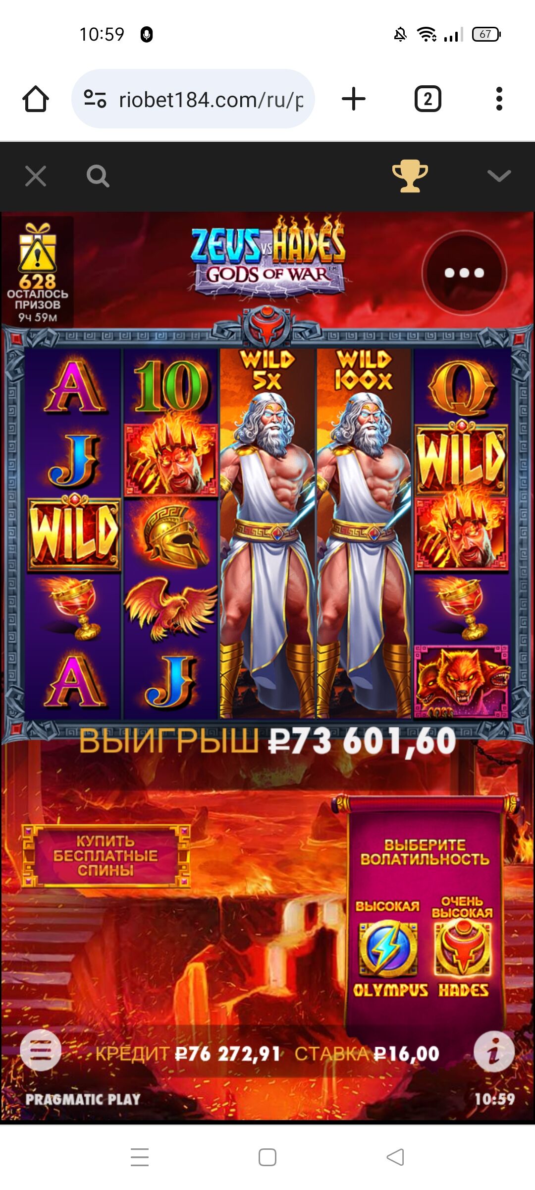 Riobet, zeus and hades, x4500. Не покупная, волатильность очень высокая, крутил не долго, сначала первый бонус пустой, через 30 спинов второй этот.