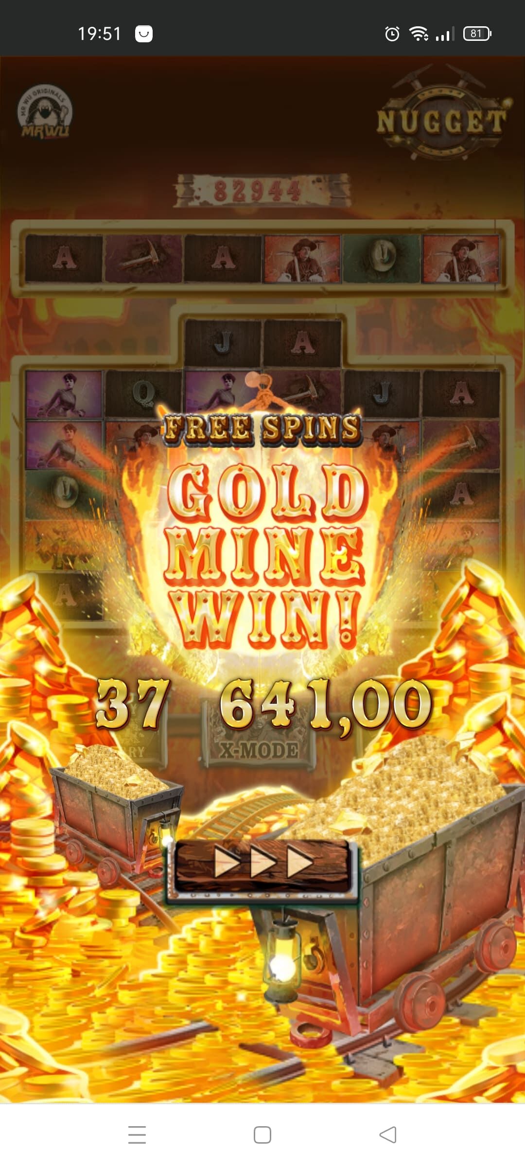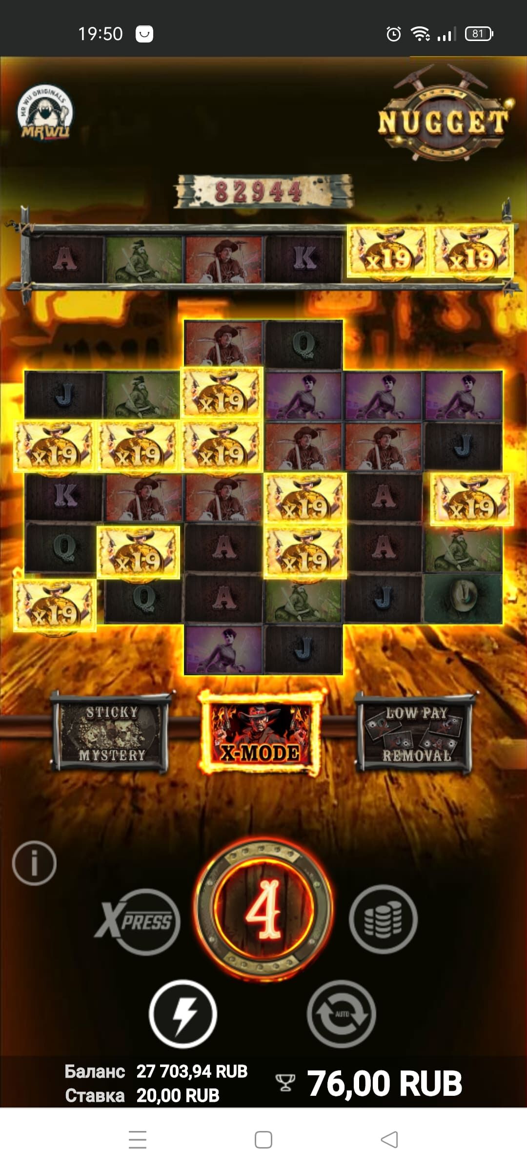 Rox casino, слот Nugget от AvatarUX x1800, не покупная, механика сложная , хрен разберёшь, дал добавочную функцию, а потом линию топовых символов на какой-то X