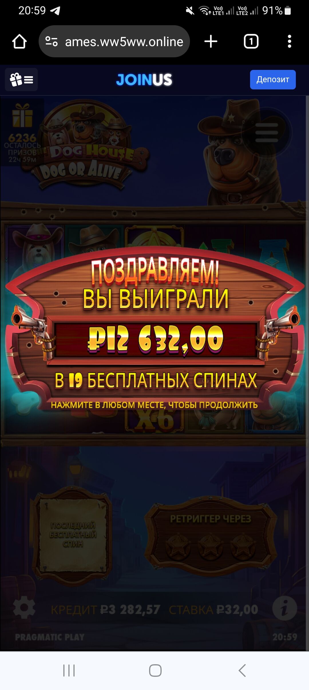 Joinusbet casino. Провайдер: Pragmatic Play. Слот: «Dog House Dog or Alive » х394