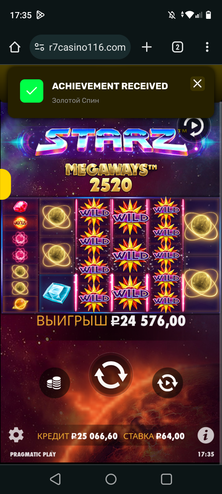 Казино Р7. Слот Старз мегафейс. Почти х400 спином, даже не думал, что так может этот слотик, по количеству линий думал выплата будет больше, но символ дешёвый.