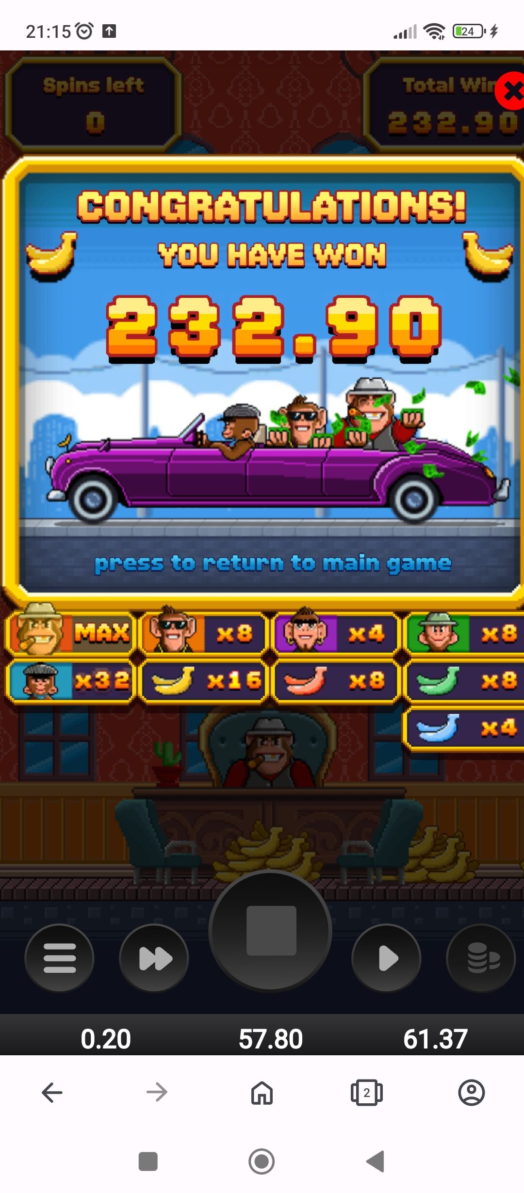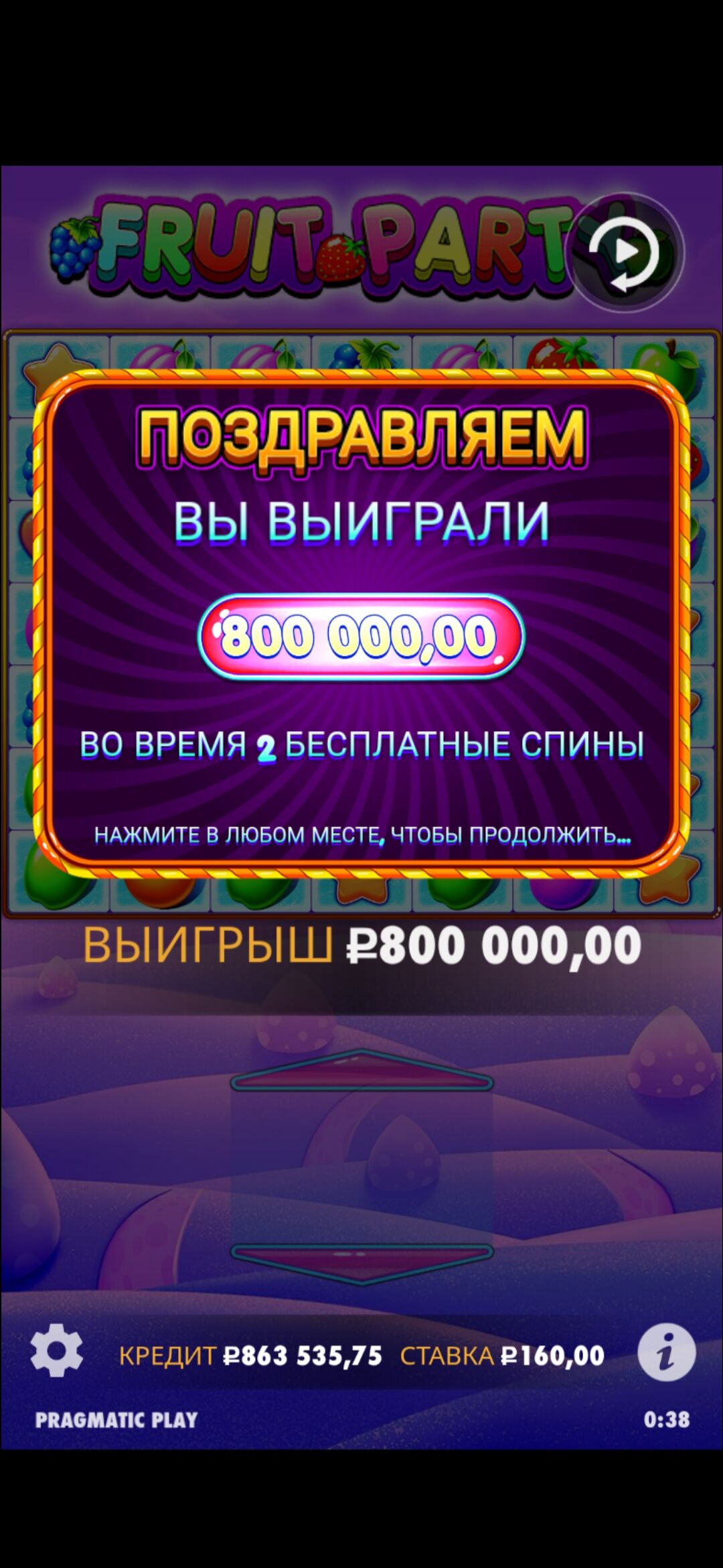 Второй раз ловлю бонус в ручную во фрут пати с максималкой, только первый раз по 10 руб поймал, а тут по 160)