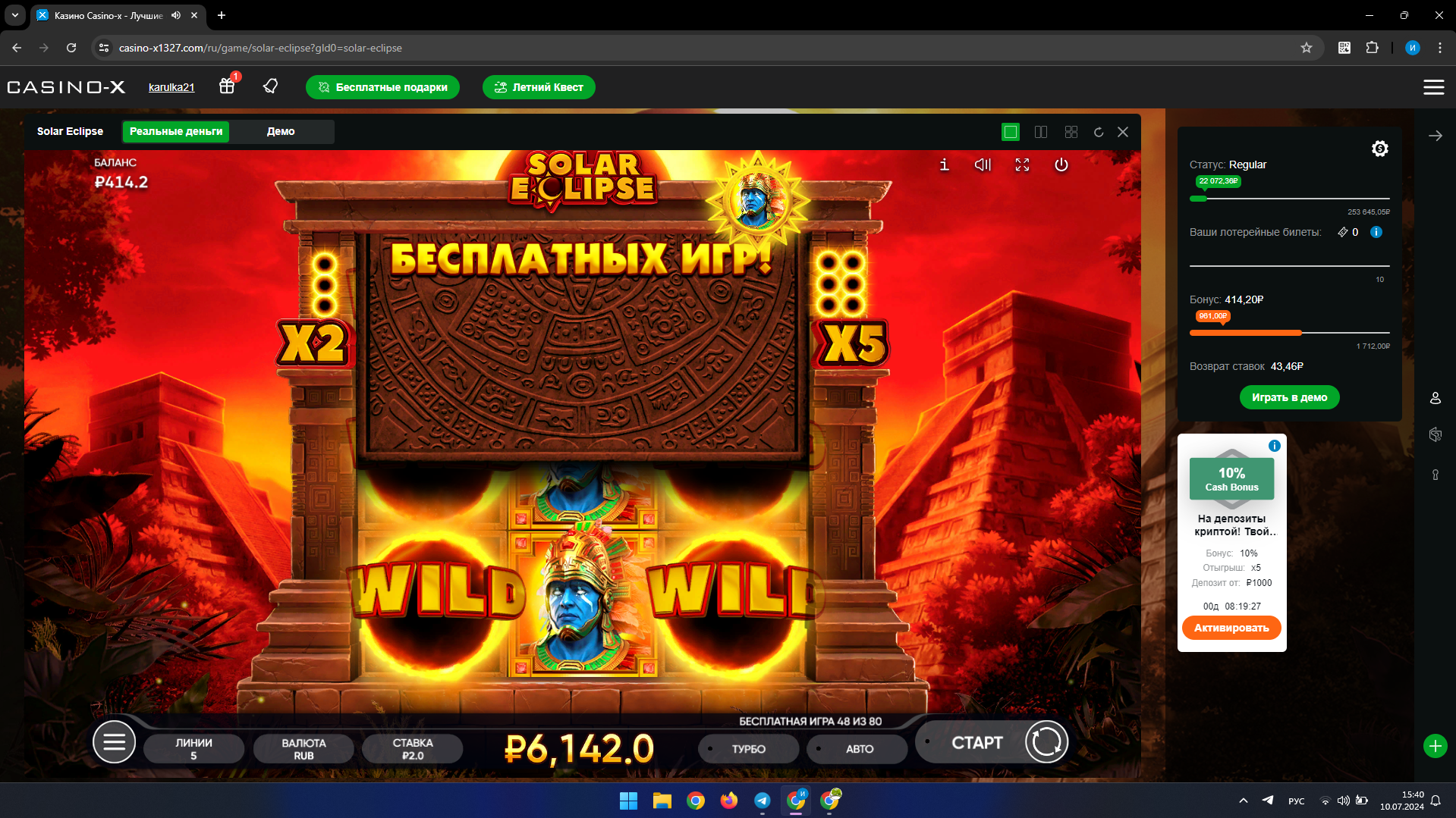 Сначала дал бонуску на х30, сделал два спина и дал фул линию через вилд.