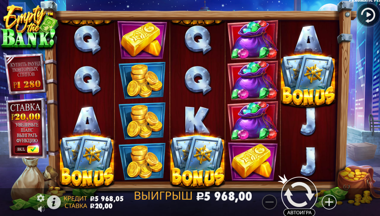 Риобет, empty the bank, выпала функция бонусная на последнем спине, баланс был 0, х373