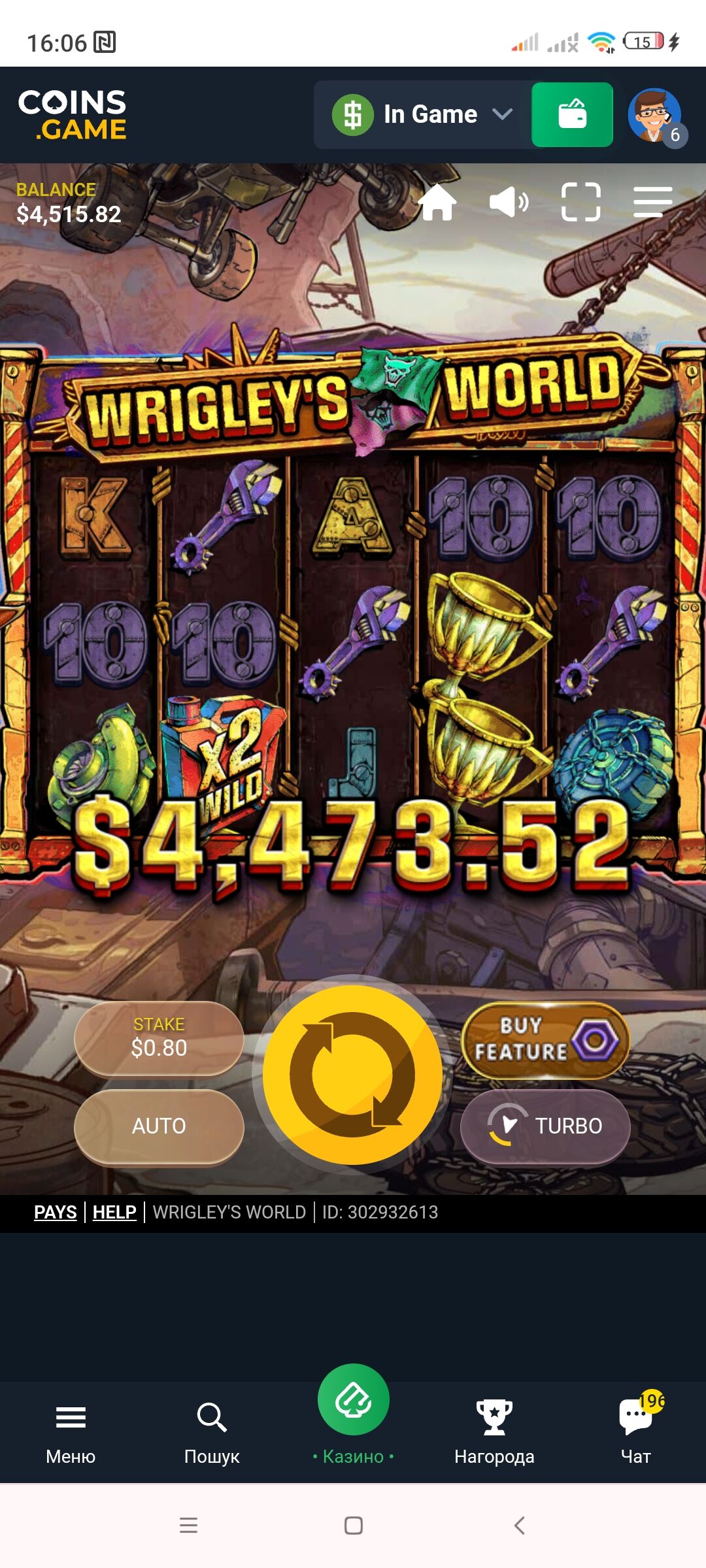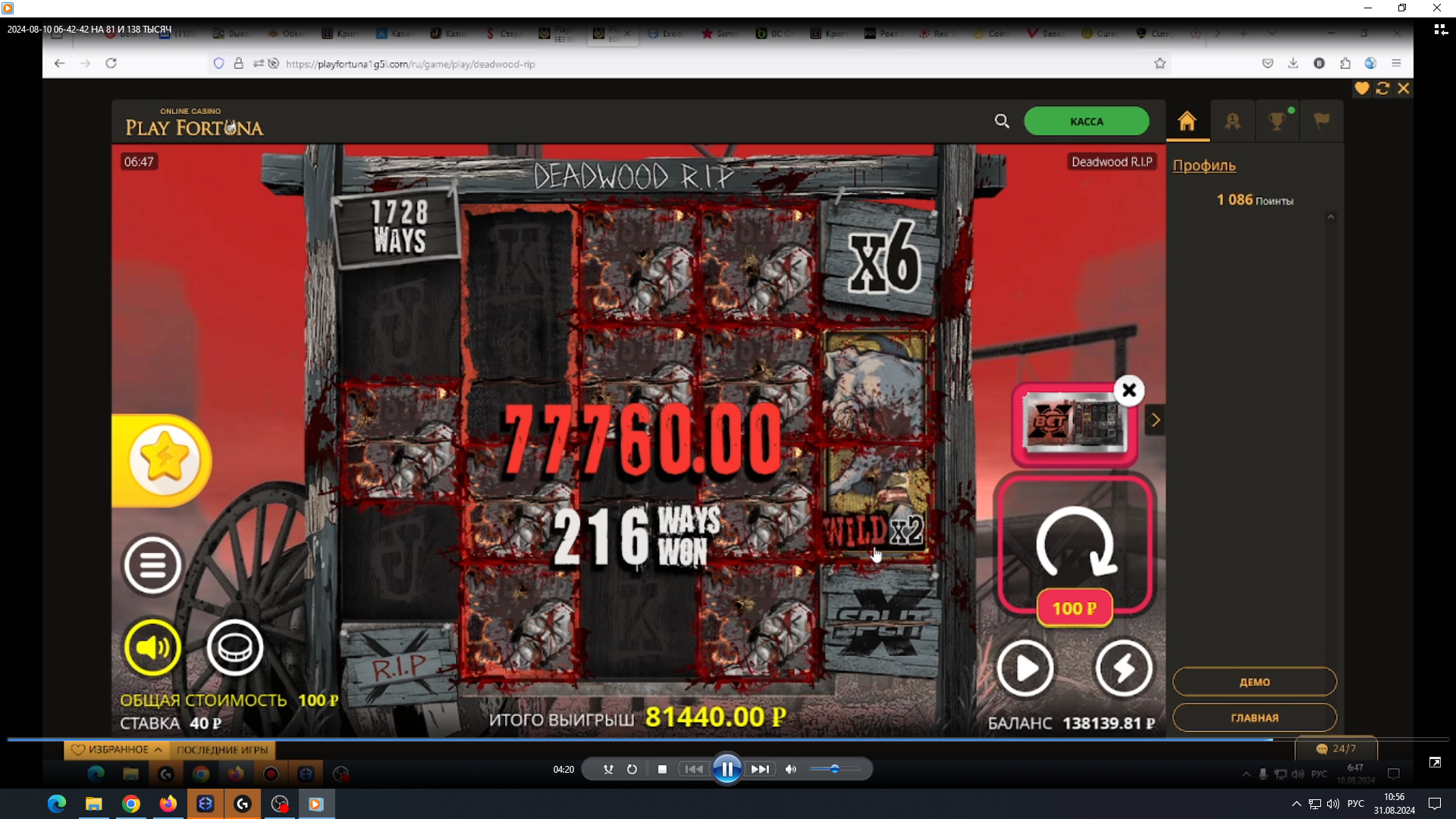 Медиа от участникаводка, том оф маднес, ставка 10р — выигрыш х640, для маднеса это почти максвин (кто играет в него вкурсе) хотя мой рекорд был х840 за несколько лет игры в него почти каждый день 😀
