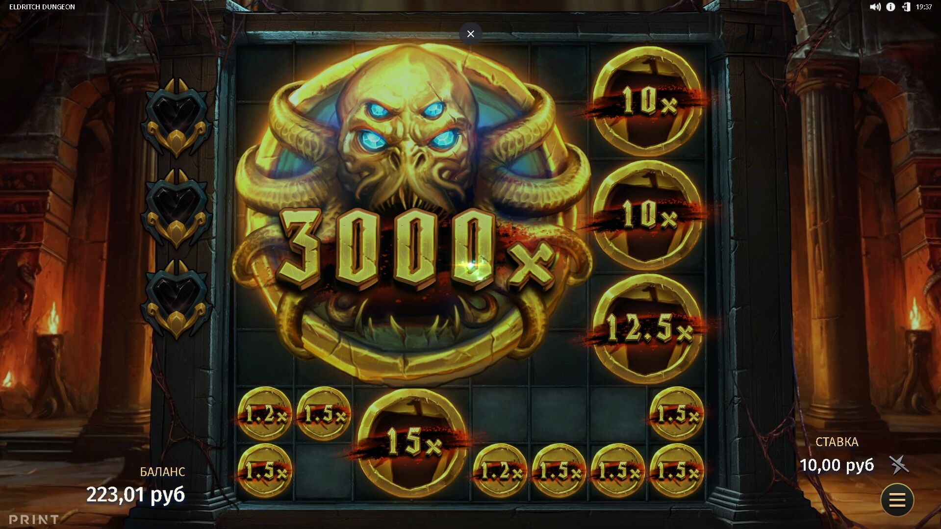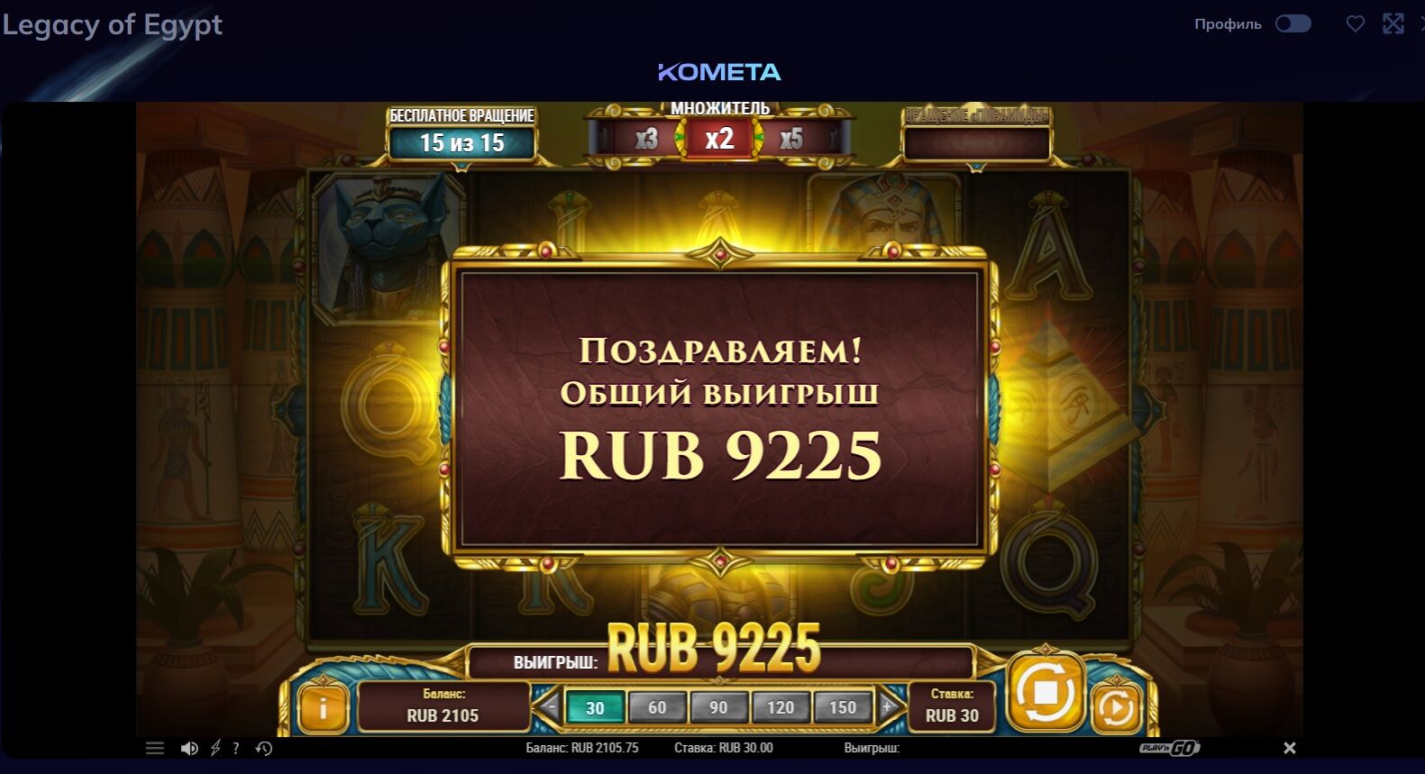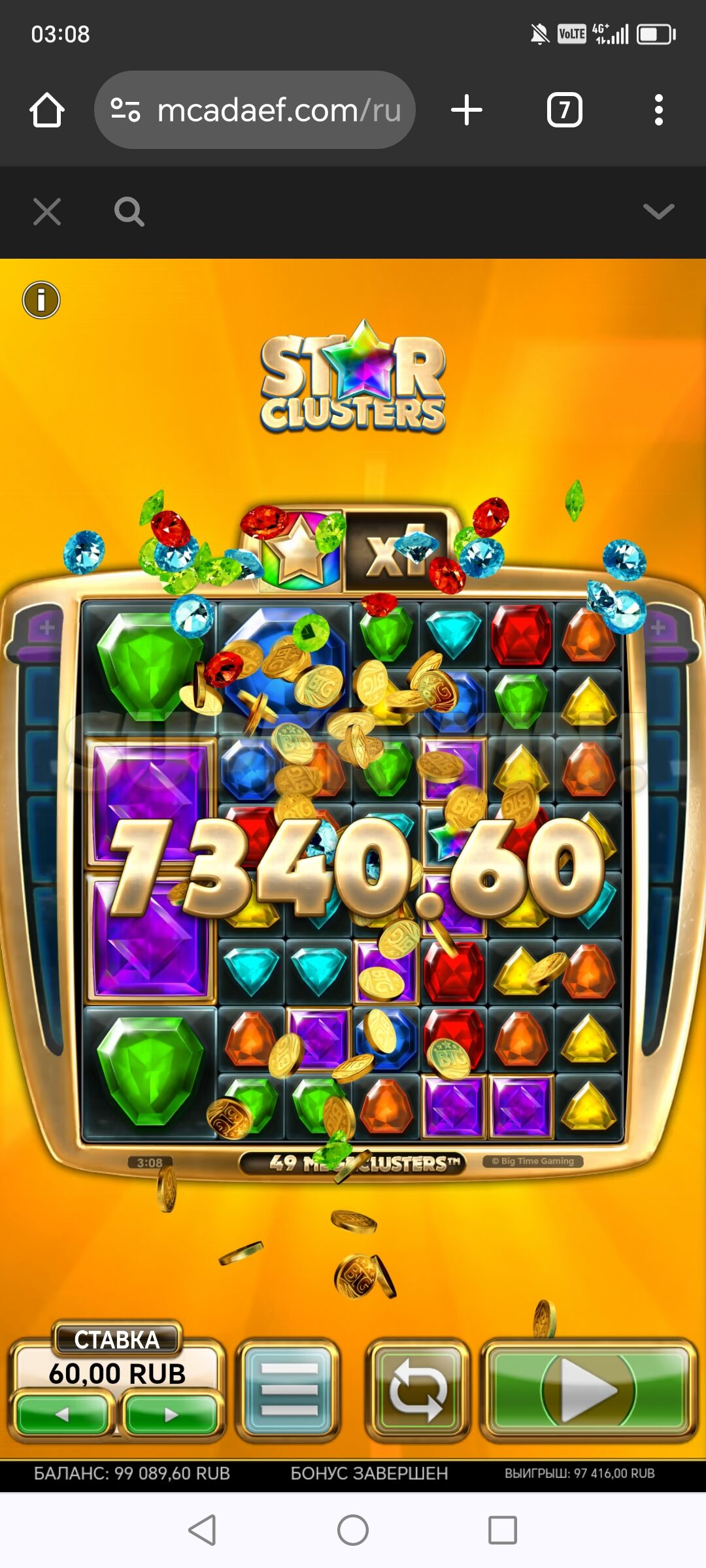 вообщем x 777 получается вроде как……..крутил часов 5 ть в него.параллельно рулетке.от 100 до 400 р за спин.только по 100 р и выдало немного.
