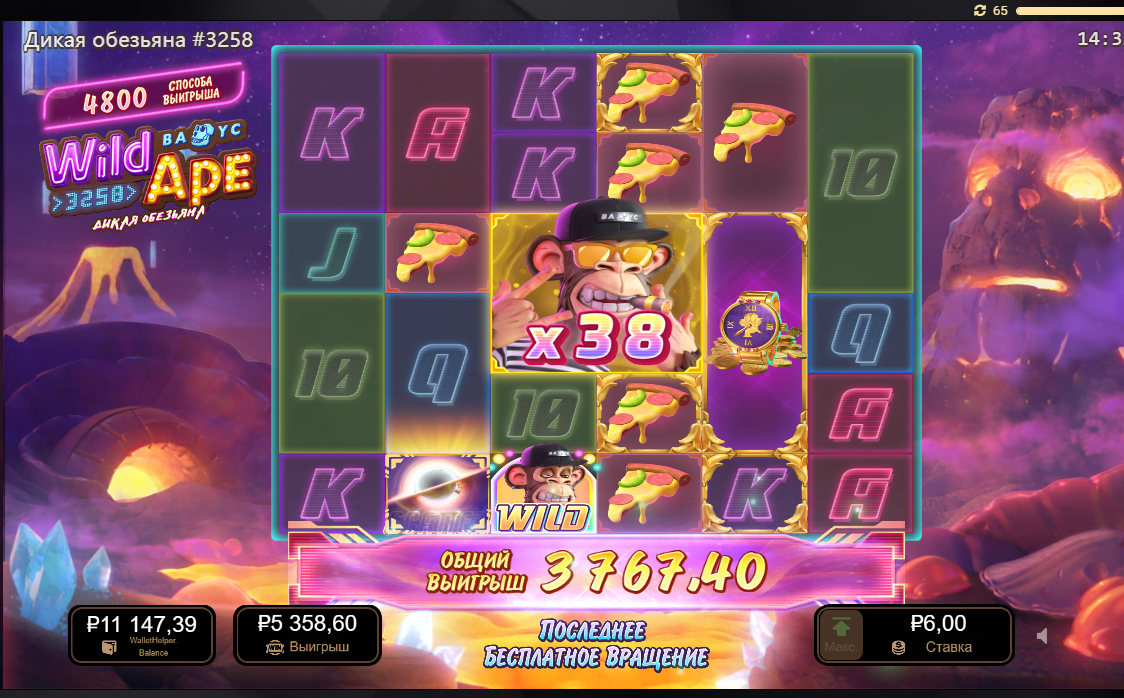 1хслотс wild ape х880 ставка 6р потому что покупал сидел, купил 130+ бонусов, играл оч не плохо но увы за такое количество это самое большое что он дал , потом жрать начал и бонусов 20 подряд без окупа (причем 80% бонусов х1-х5 чисто)