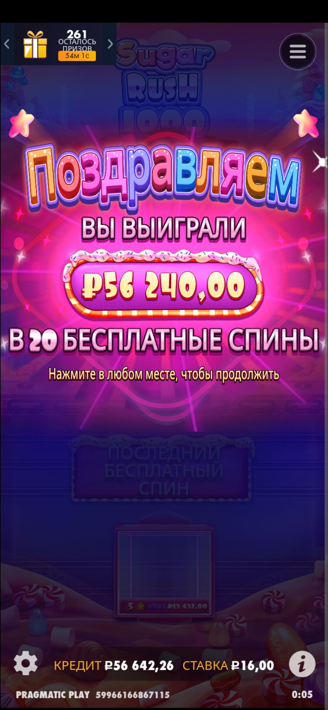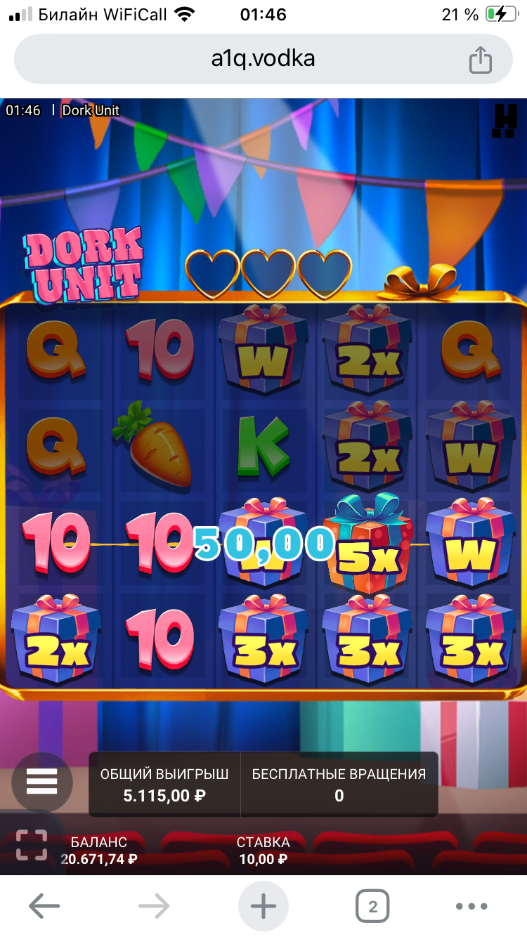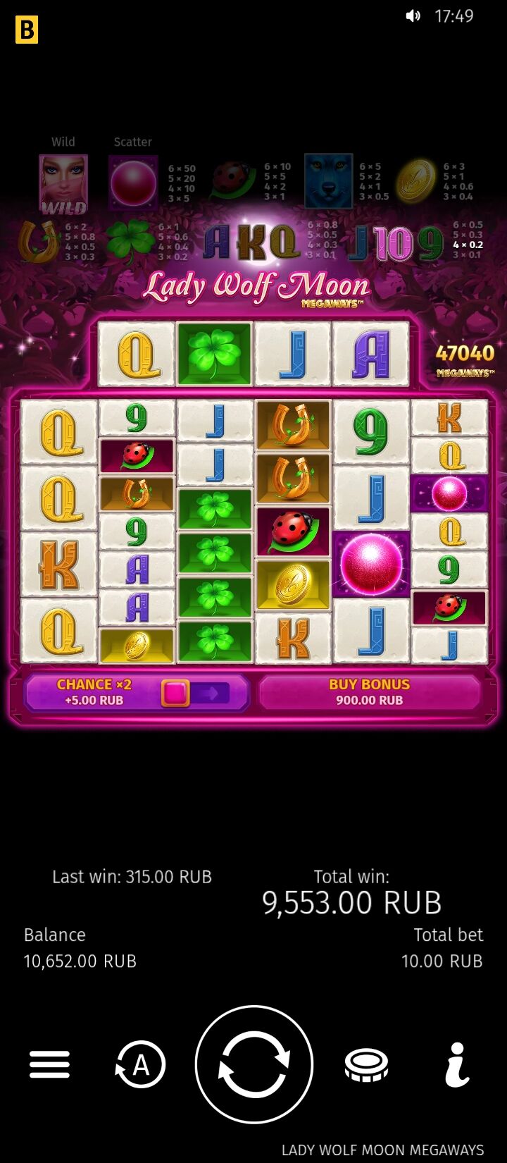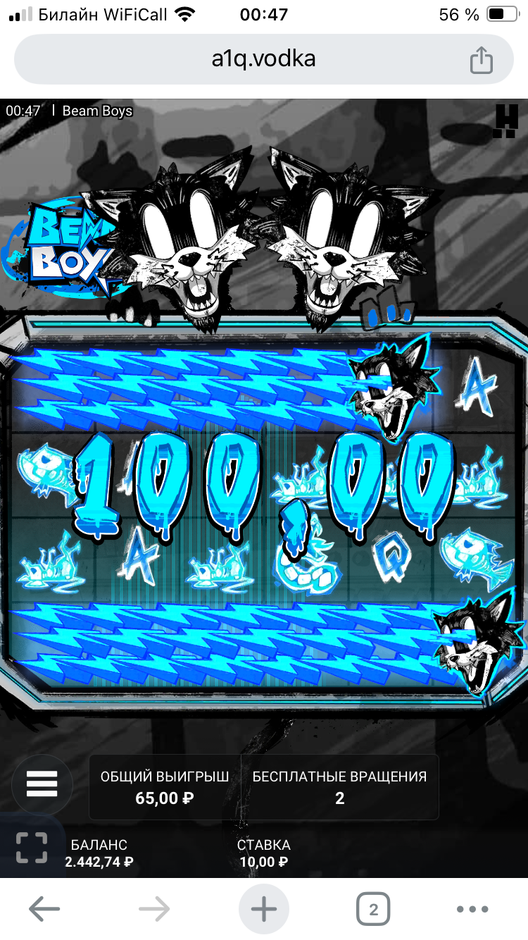 Извините, сам не люблю такие скрины, где только результат. Выпало 2 кота в последнем 5 ом барабане.
