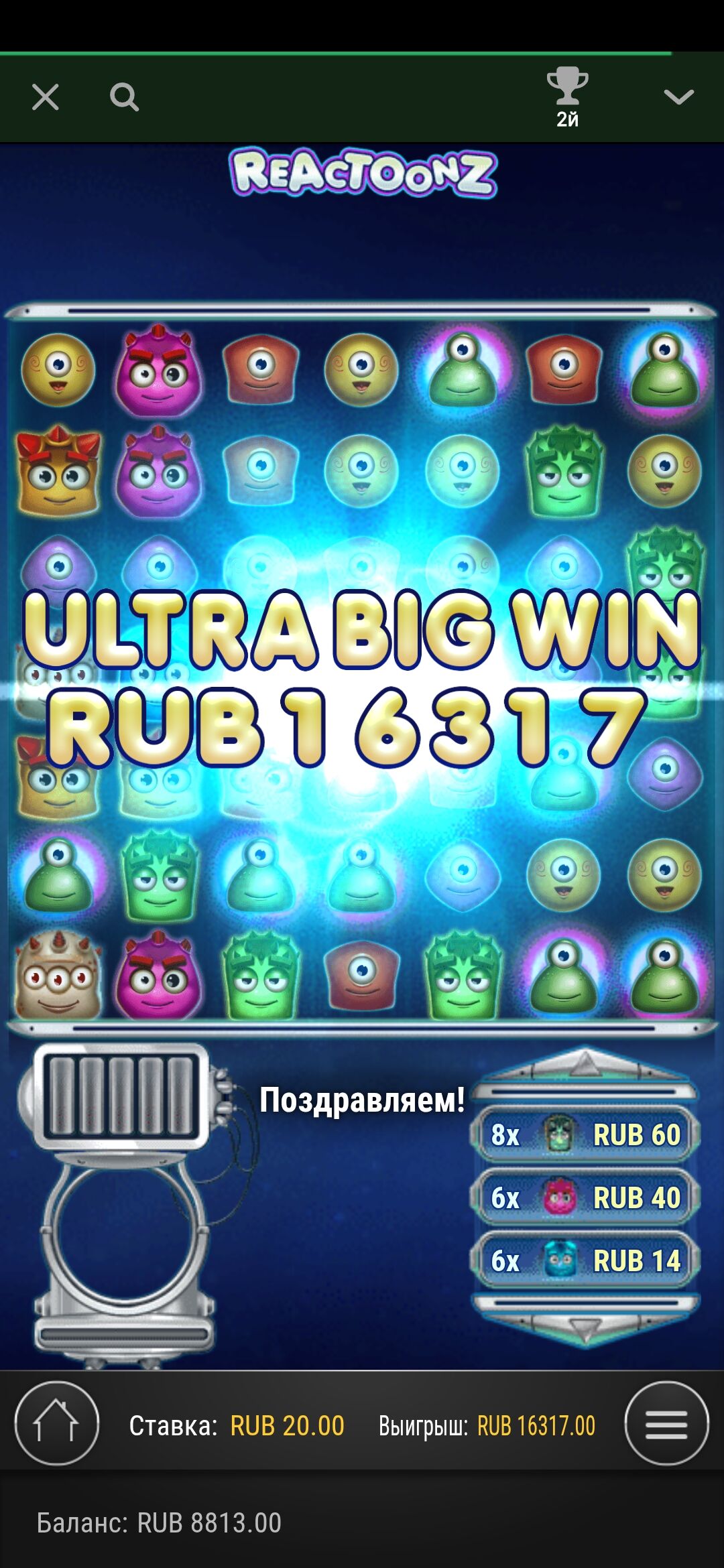 Reactoonz приятно удивил давно такого х не ставил + в турике занес 2 место, 400 фриспинов +3к в копилку .