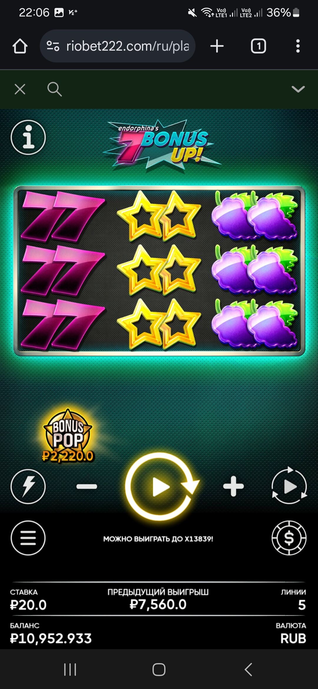 х378 дало поле 🍇 800р далее в бонусной игре пару спинов вышли лимон и ещё чего-то, третий спин в бонуске выпало на максимальный х7 , играл на автомате не успел пробить , проверить карту .