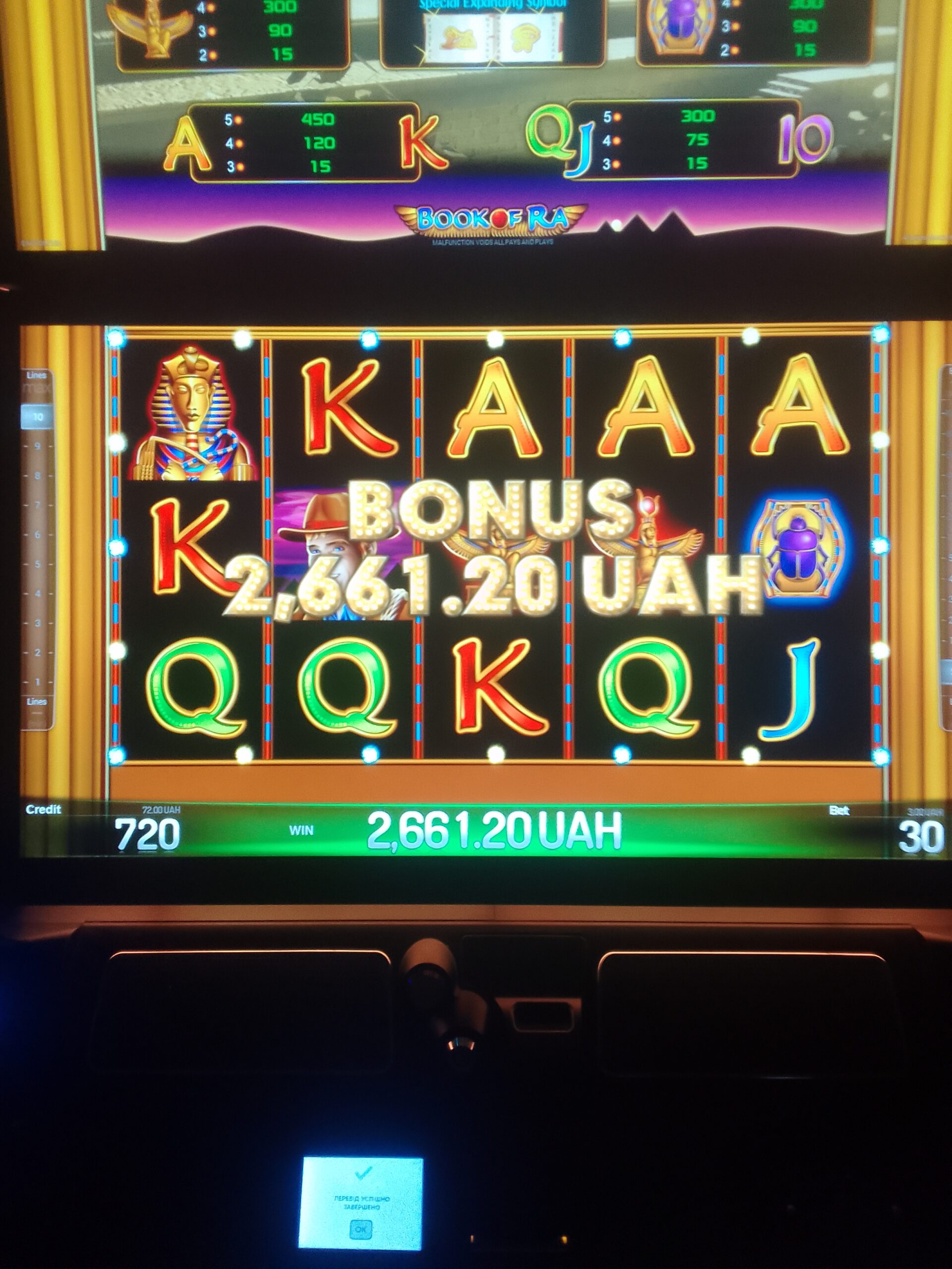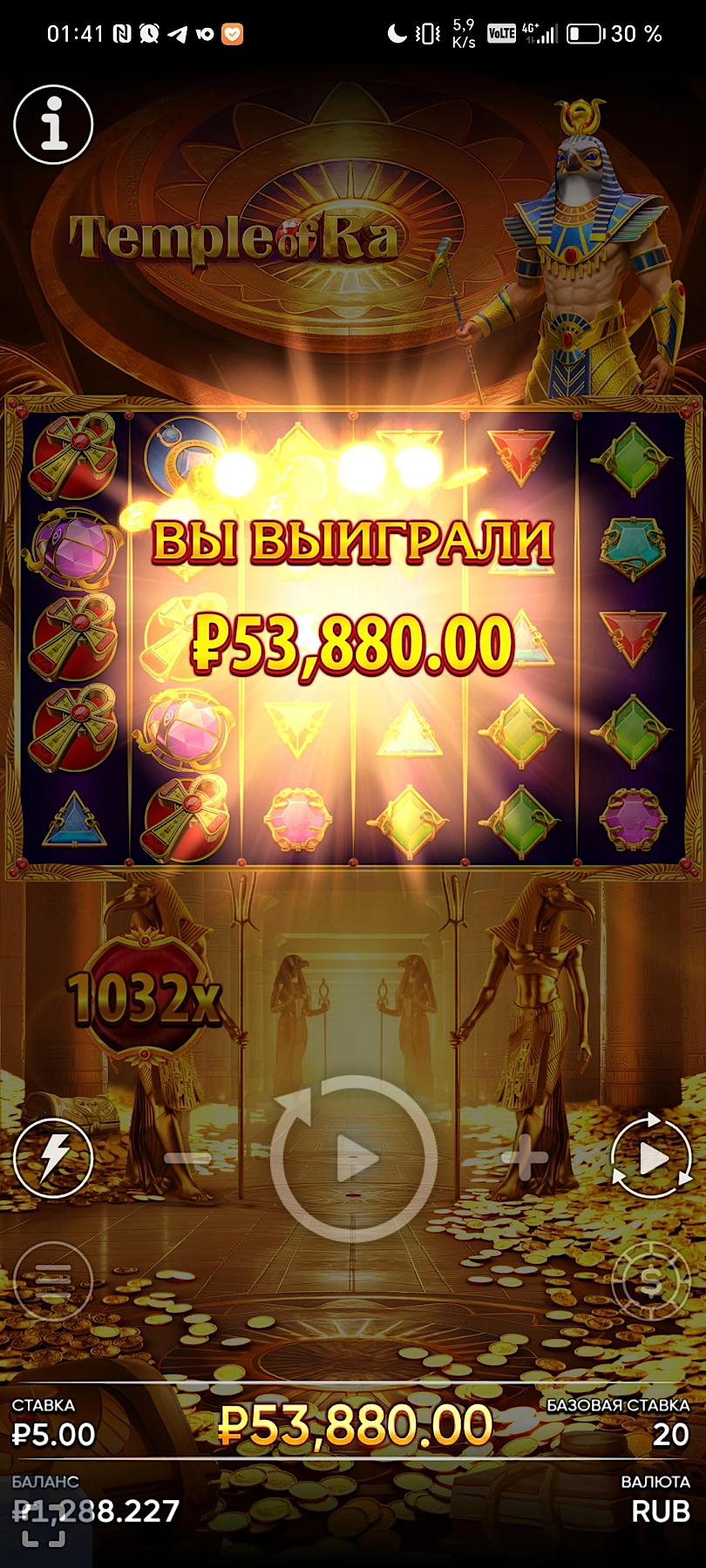 х10000 по ставке 5 рублей в слоте “temple of ra”.