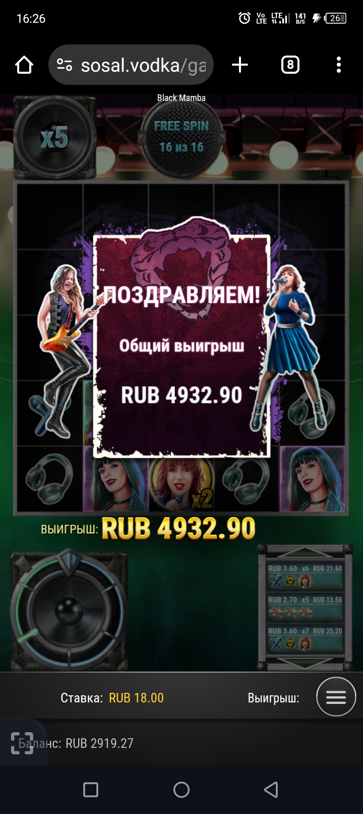 Казино Водка, провайдер плей анд гоу , слот блек мамба, ставка 18 рублей 274 икс на Александре