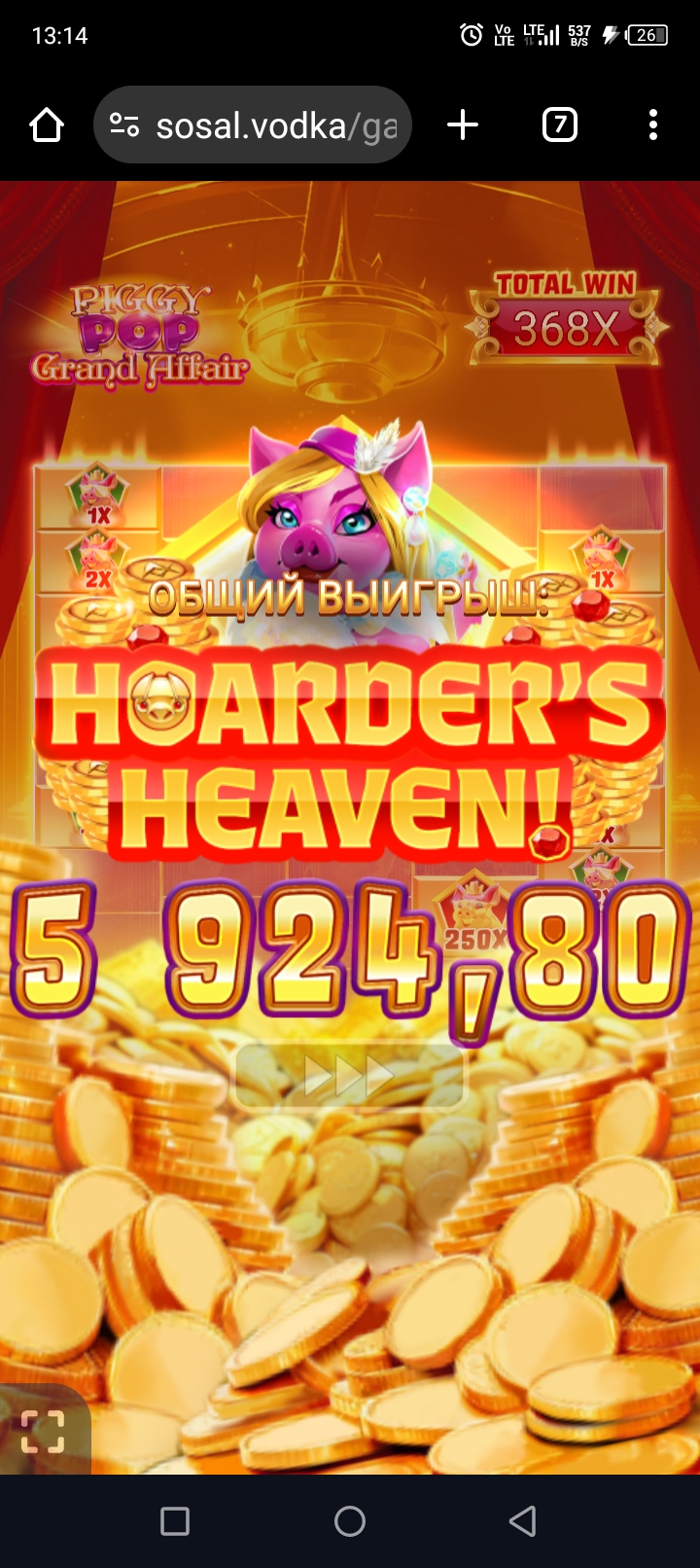 Казино Водка ,слот Piggi Pop, провайдер Avatar ux, ставка 16 рублей , икс 370