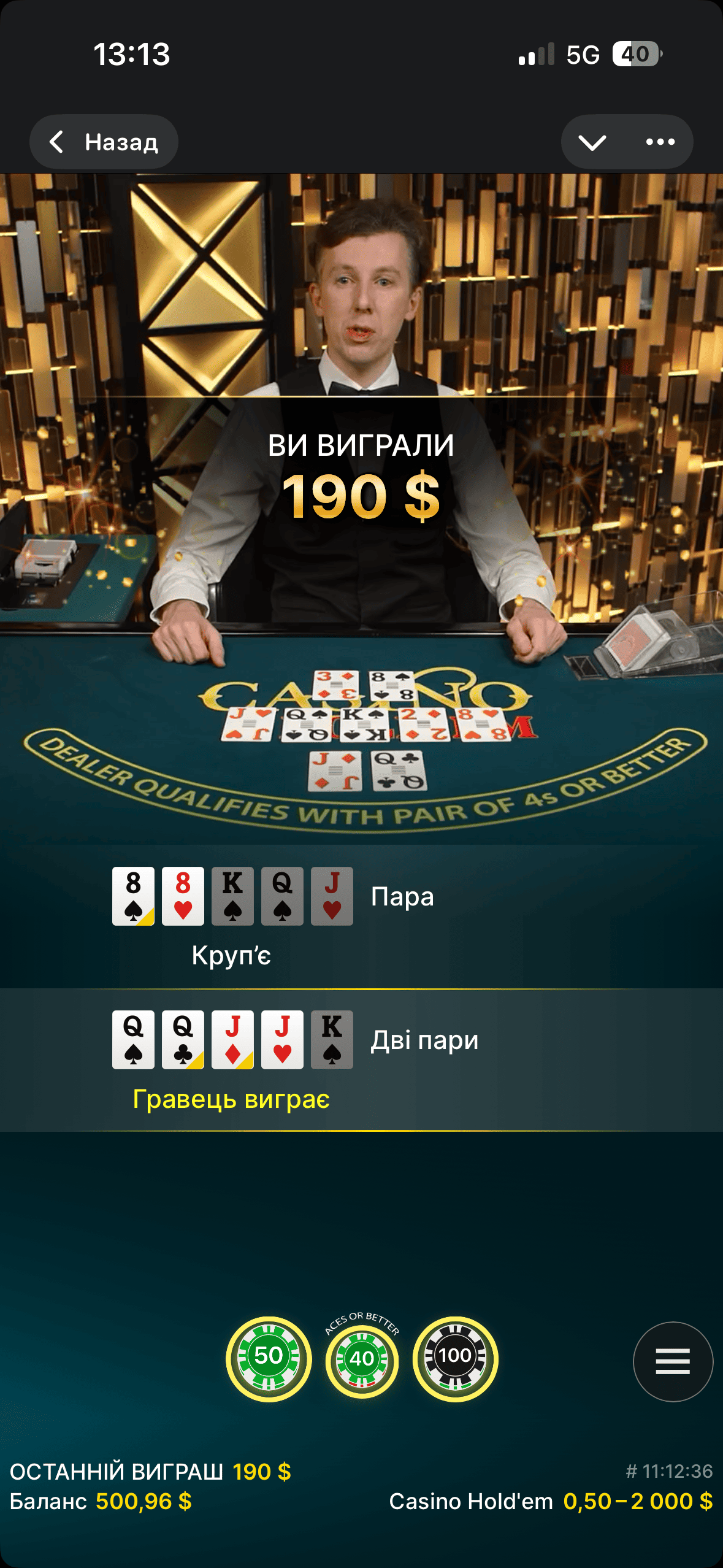 заносик в casino hold’em, сыграл бонус и я выиграл 190$ со ставки 30$