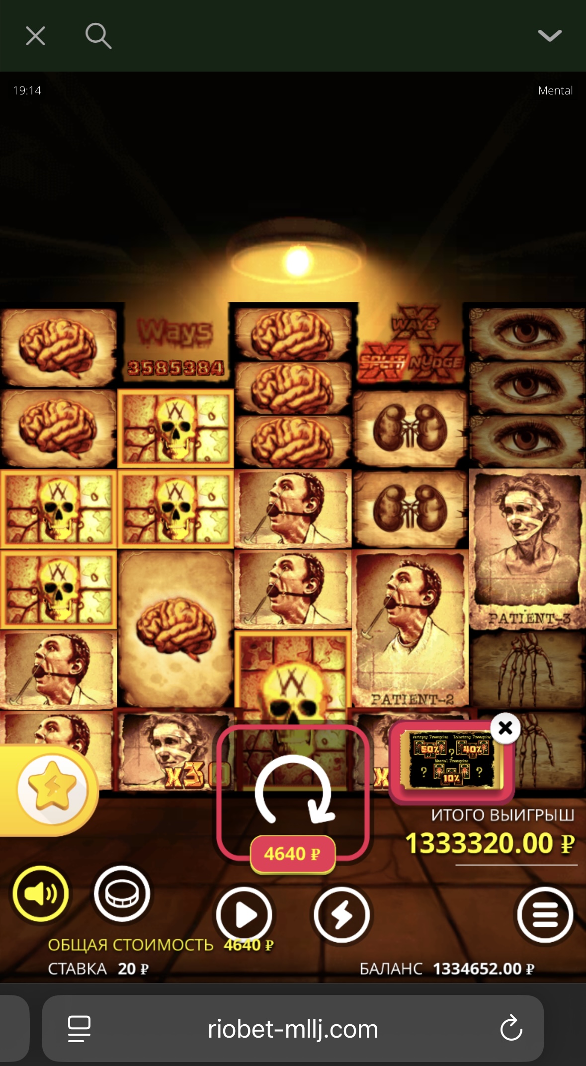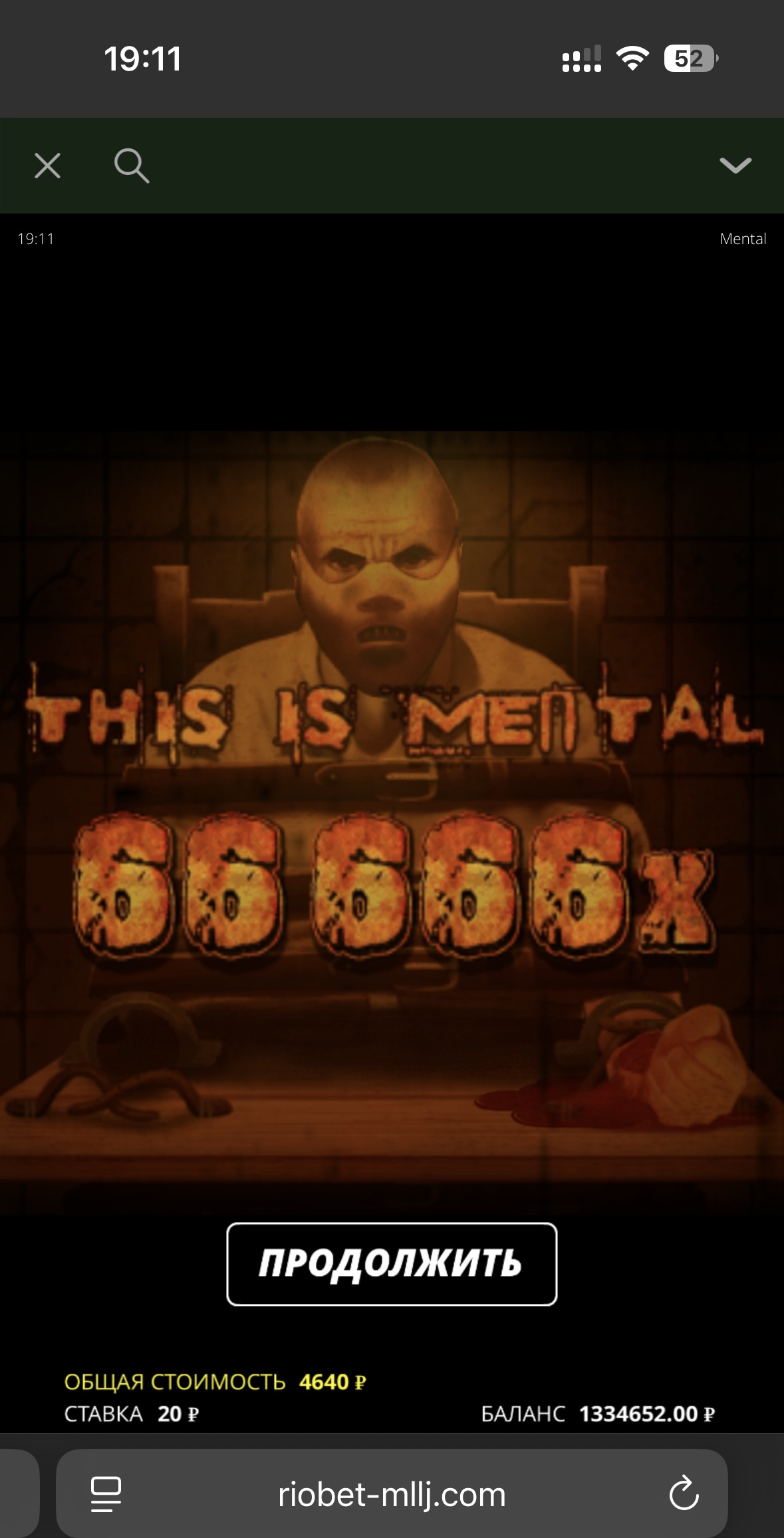 Казино Riobet, x 66666-максималка по 20₽, слотик Mental