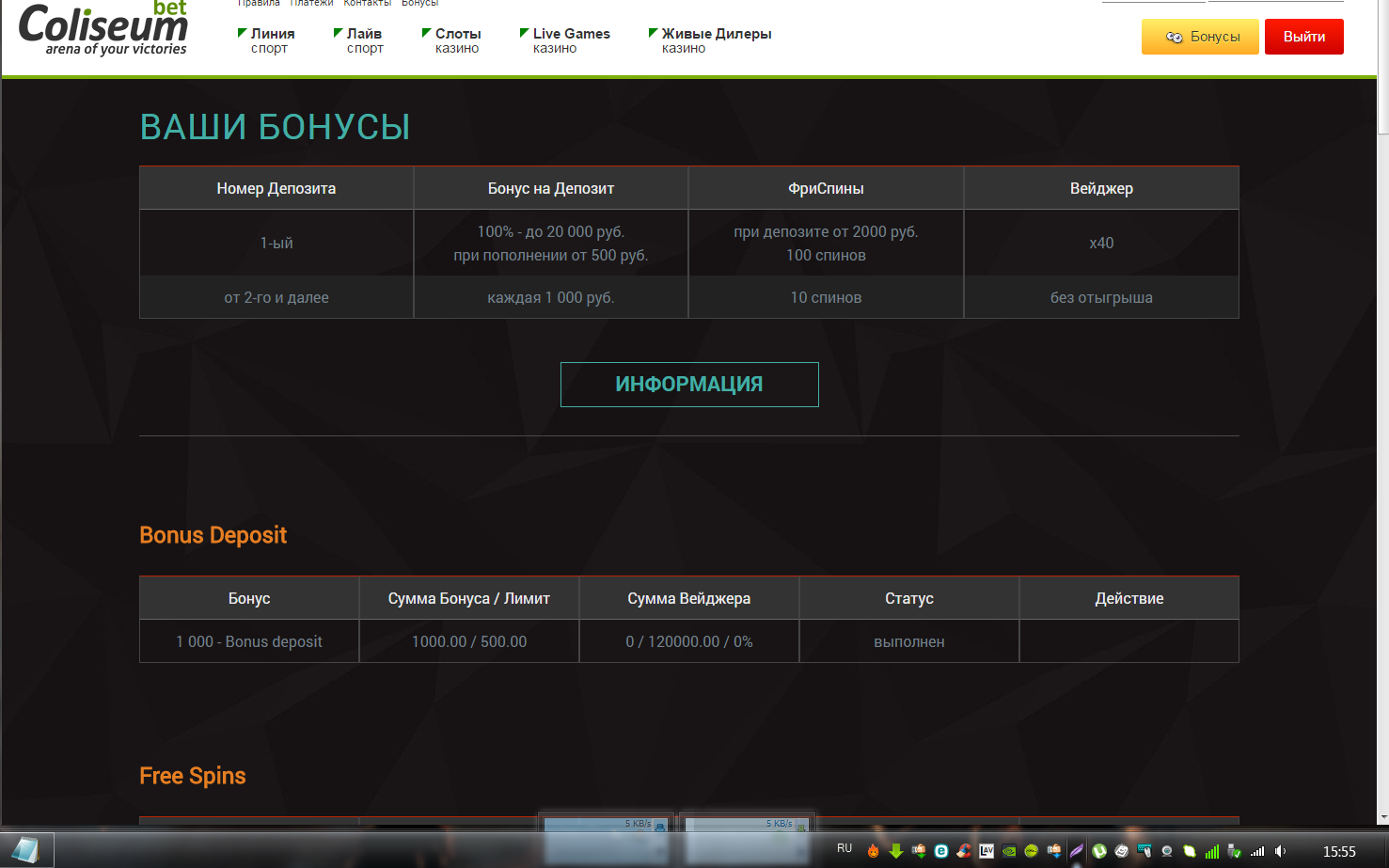 Медиа от участникаВот такое вот дело выгорело 🙂 Набрёл случайно спасибо за тему Feya_Line тема тут http://latestcasinobonuses.bet/forums/topic/27985-bezdepozitnyi-bonus-v-coliseumbet-casino-v-razmere-1000-rublei/#entry116887 единственное что получилось найти 🙂 Очень уж хотелось.. Но бездеп там с мего вейджером х120 ,, но было скучно,а денег ноль, а покрутить хотелось просто губа трусилась., Вот и решился на это дело . Мало вышло на круг, но усилий победить было приложено много. Зато если выведут, будет на чё покрутить по мелочи. 🙂 Вот немного о моих стараниях. Пару ярких моментов.