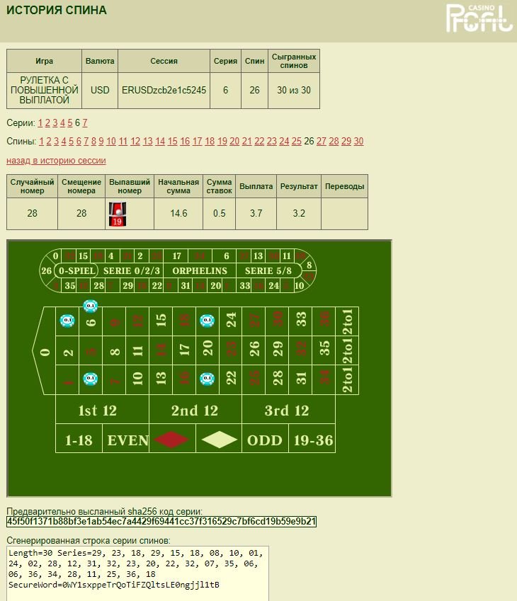 В казино профит есть рулетка с повышенной выплатой… Фишка 0,1$ в номер «19» сыграла, выигрыш равен 3,7$. Здесь контроль честности и есть возможность сгенерировать на перед игровую сессию до 100 спинов. Так же есть возможность делать смещения (выпал случайный номер 28 а у нас смещение на 28- мь номеров, получаем выигрышный номер красн нечет «19»)
