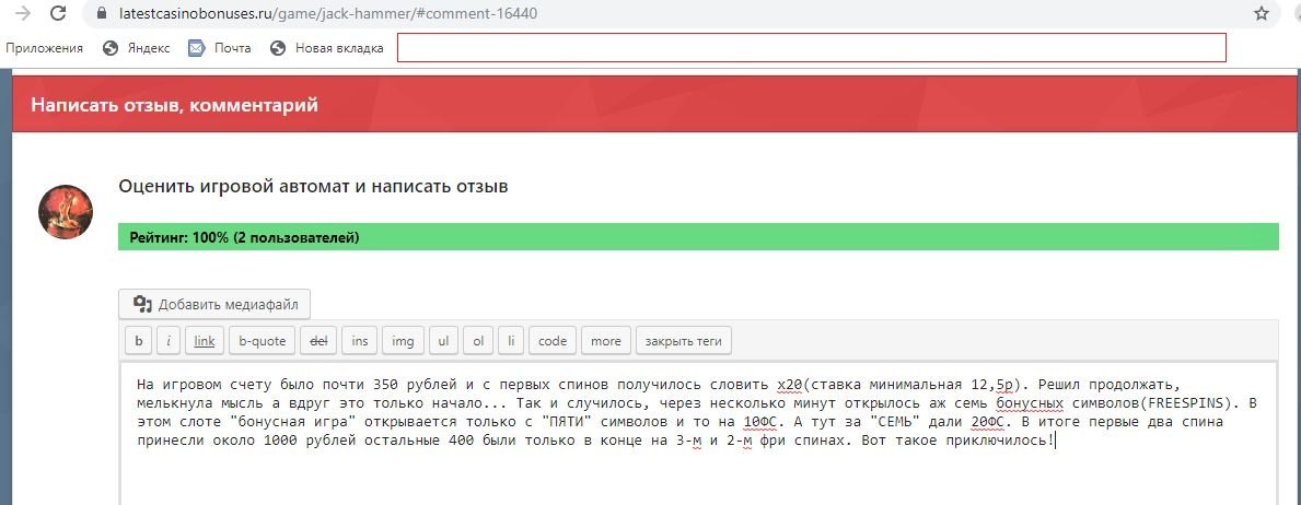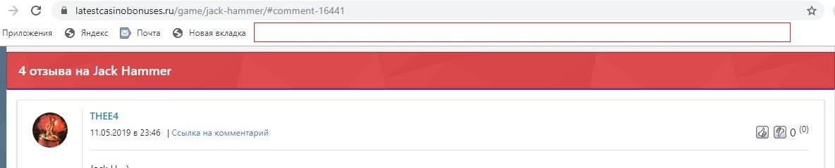 Несколько раз попытался разметить отзыв на слот «JACK HAMMER» и все безрезультатно, После написания отзыва и тыка на кнопку «Разместить отзыв», текст не сохраняется… Началась старая песня) Хотя в… строке и есть номер коммента…