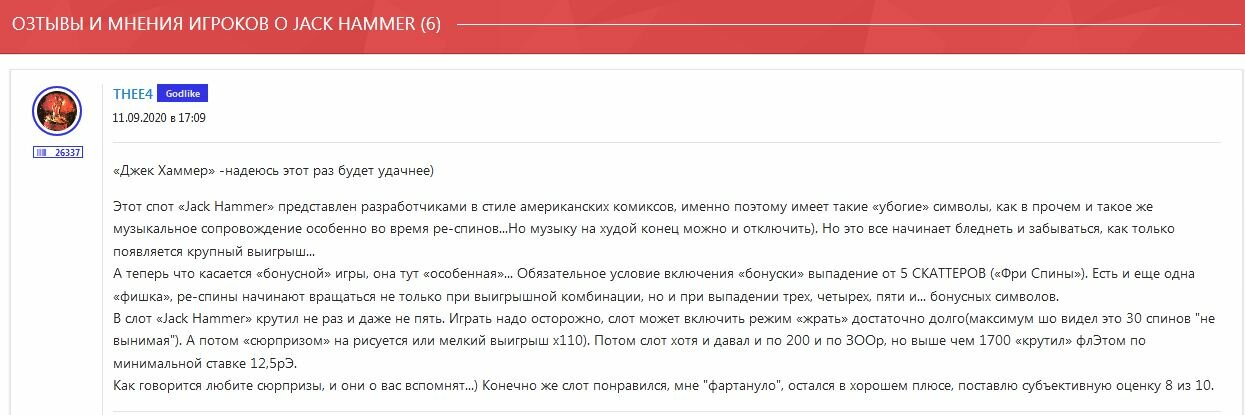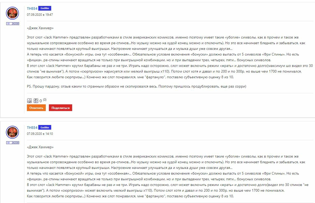 Так ни чего и не понял, седня снова попытался выложить отзыв за слот «Jack Hammer»надеялся что баг убрали и отзыв будет в полном объеме, но увы фсе осталось как и было раньше -обрезанный по объему отзыв. Шо такое хз.