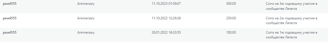 Предыдущее начисление у вас за годовщину на сайте было 11.10. И позапрошлое в ту же дату.