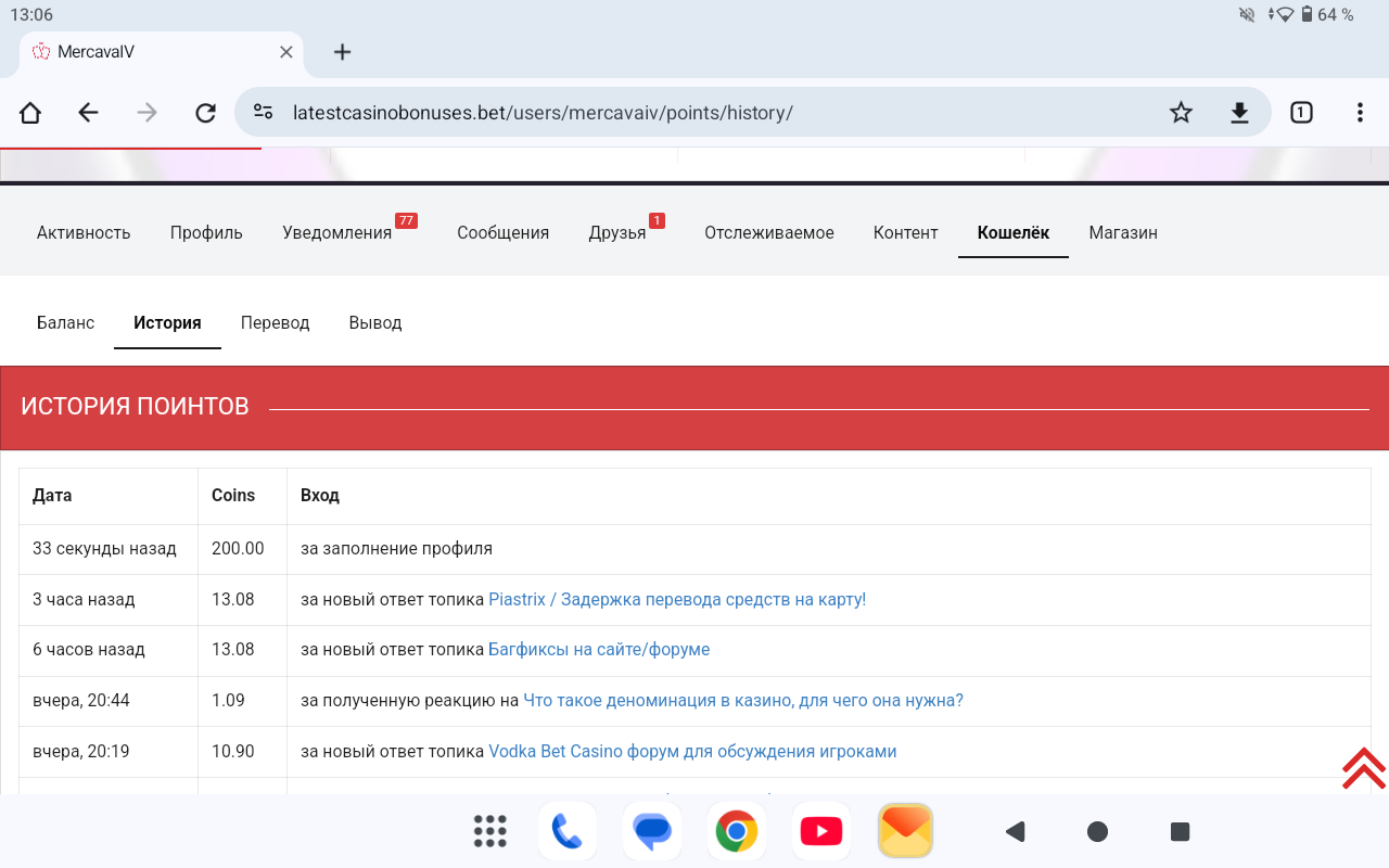 Доброго дня! Нет зачисления за ежедневный вход, за сообщения на форуме, также сейчас не зачислили 200 поинтов за заполнение профиля. Не приходят уведомления на почту темы- обсуждения бонусов кодов и бонусов казино.