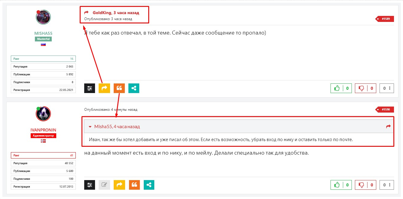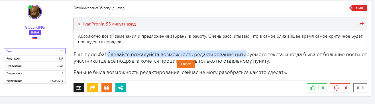 Еще просьба! Сделайте пожалуйста возможность редактирования цитируемого текста, иногда бывают большие посты от участника где всё подряд, а хочется процитировать только по отдельному пункту.