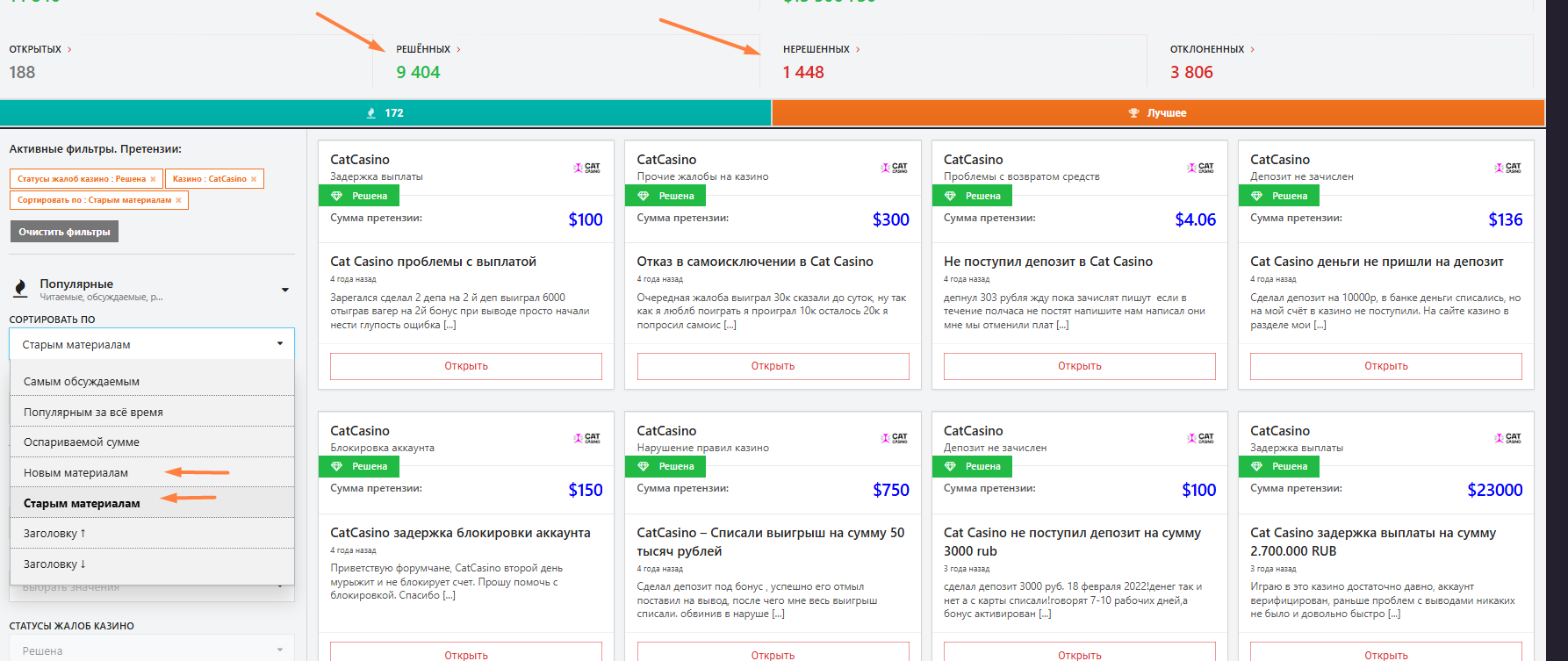 У нас есть система фильтрации: можно отдельно выбрать “Решённые” или “Нерешённые” жалобы, а слева отсортировать по новым или старым материалам, а также указать конкретное казино.