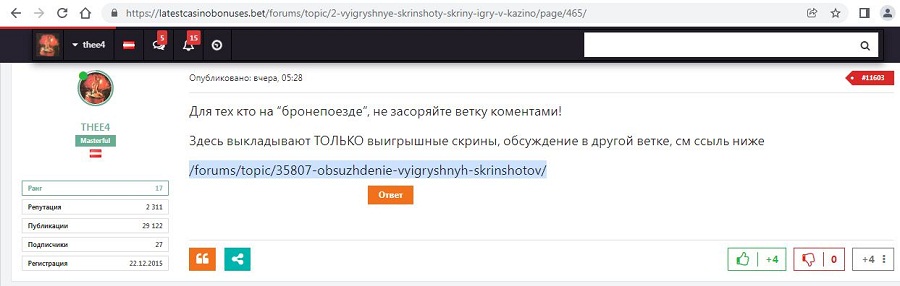 Тут решил поправить «молодежь»)… И написал пост в ветке «Выигрышные скриншот. Скрины игры в казино», скопировал полностью ссылку на «Обсуждение выигрышных скриншотов» и попытался выложить, но она получилась не полная. Если это возможно измените, плиз.