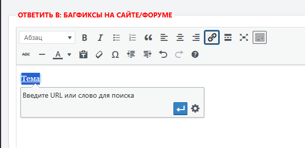 Выделите слово ( например: «Тема» или «Вот здесь жалоба» ), затем нажмите на кнопку «Ссылка» в редакторе. В появившемся окне вставьте ссылку.