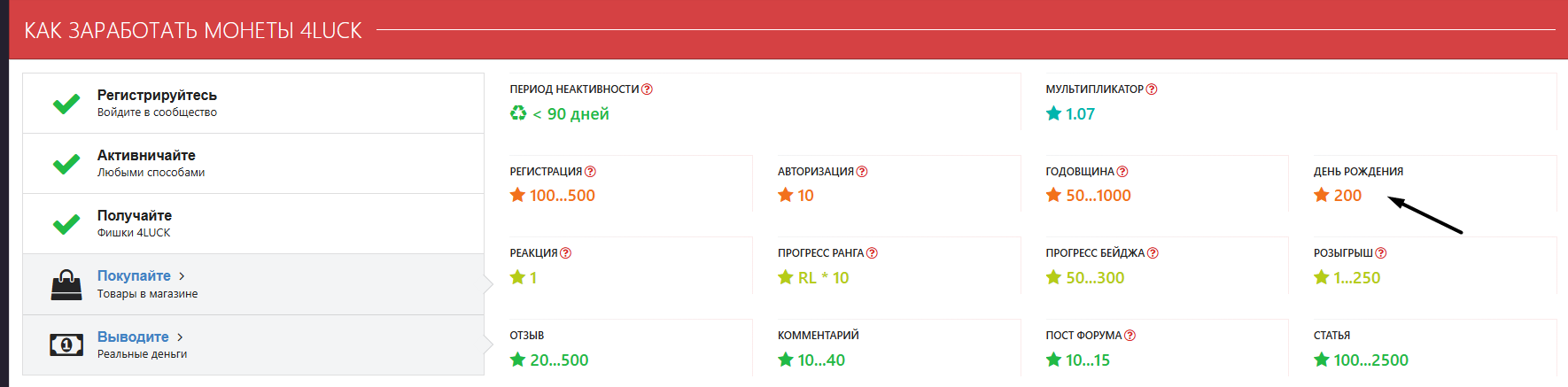 @gans2115 Начисляется за День Рождение 200 Coins, только важно указать дату рождения в вашем профиле!