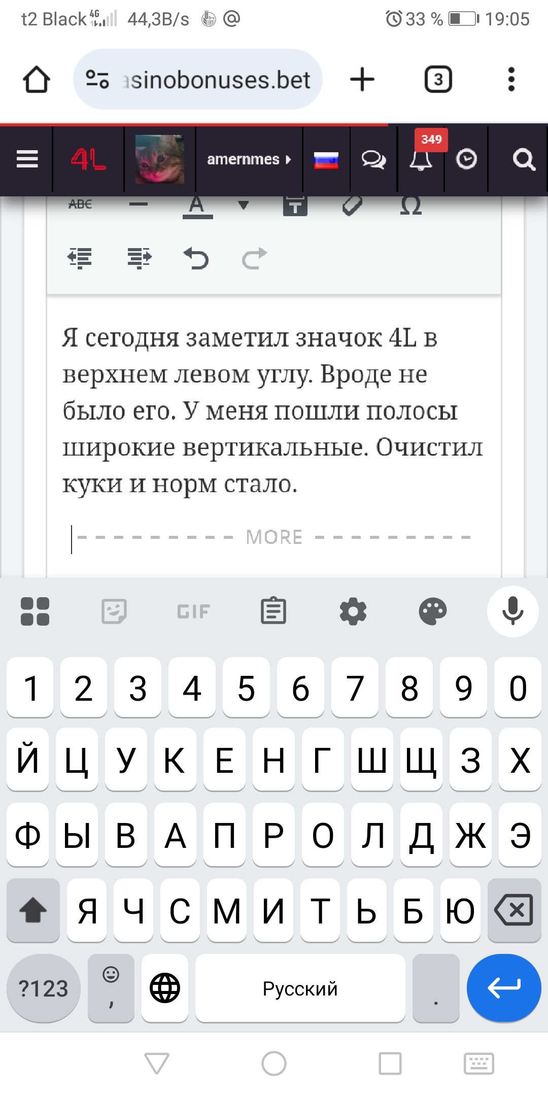 Я сегодня заметил значок 4L в верхнем левом углу. Вроде не было его. У меня пошли полосы широкие вертикальные. Очистил куки и норм стало.