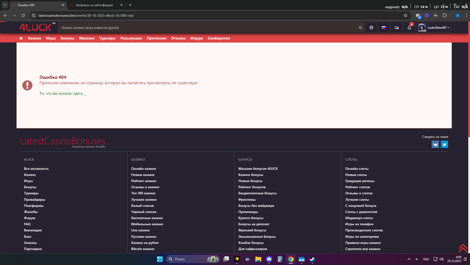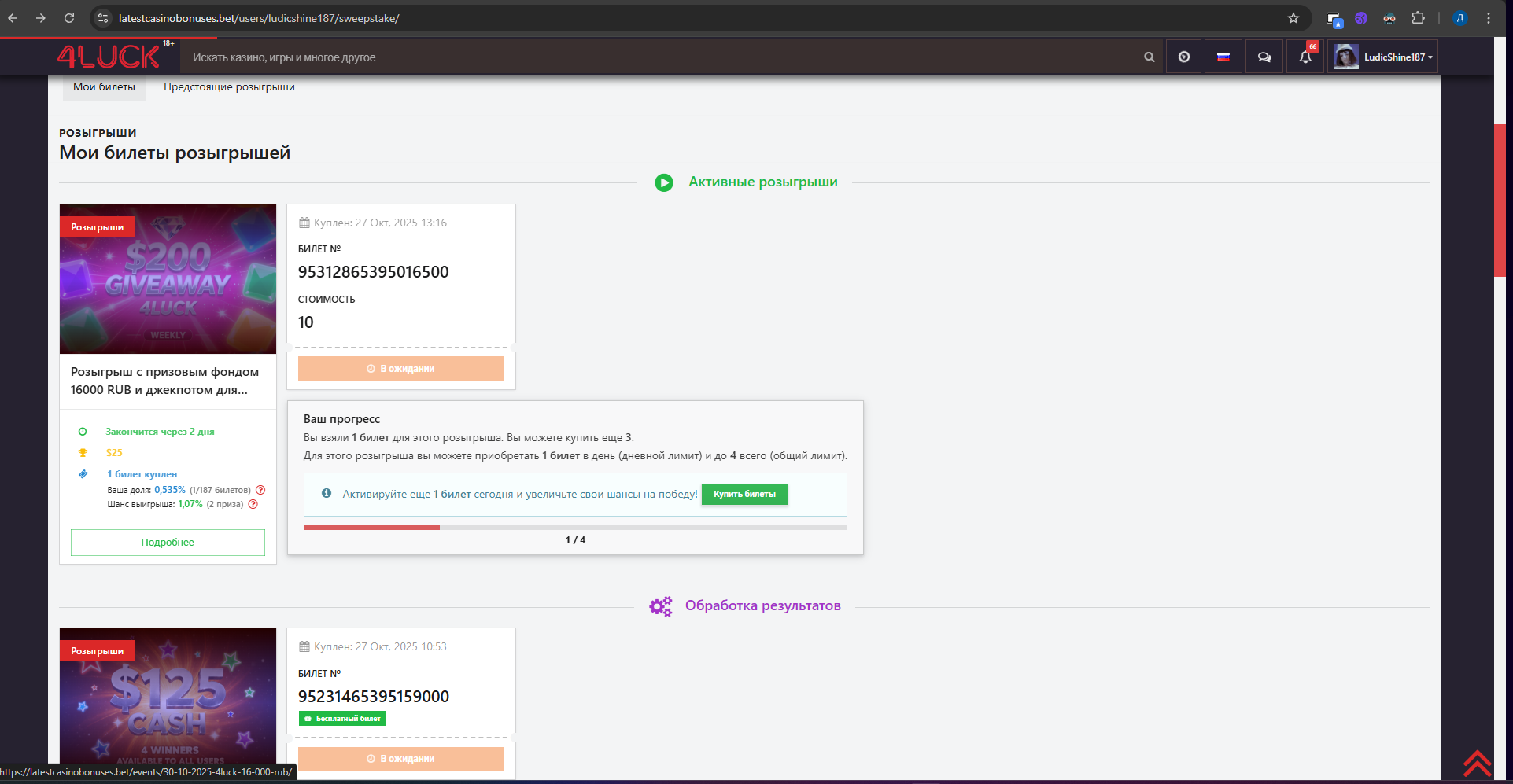 Если с профиля зайти в раздел «Розыгрыши», и попробовать купить билет, то происходит редирект на 404 ошибку.