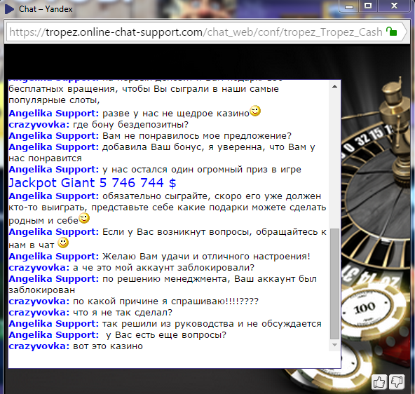 Кароче нашел в инете бездепчик 10$, в Casino Tropez, написал в сапорт типа дайте мне бездеп, она умоляла меня сделать деп так как там супер бонус на первый депозит, но я написал что хочу бездеп, она дала мне 10 $, не успел зайти в игру и тут мой аккаунт заблочили, кароче вот!