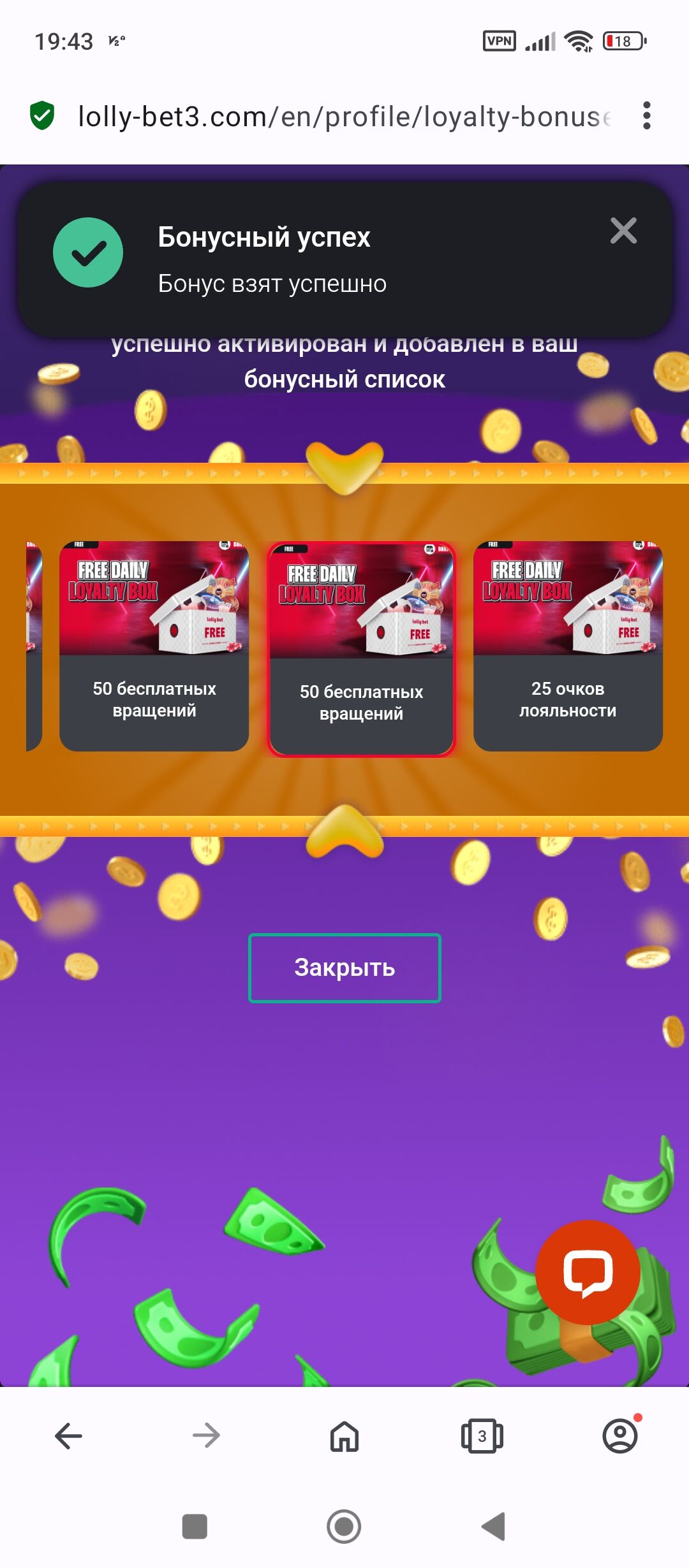 В Lollybet в профиле в акциях есть Мистери бокс,выпало 50 фрих в Book of Dead,отыгрыш как я понял там же