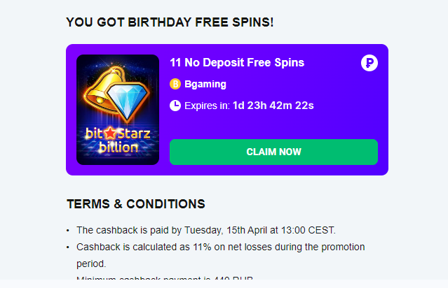 Bitstarz в честь своего Дня Рождения начисляет 11 фриспинов.