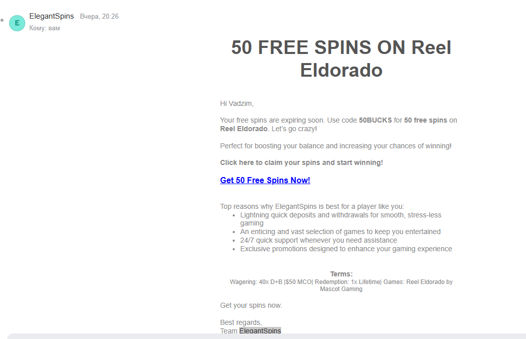 На почту пришло от ElegantSpins Casino
