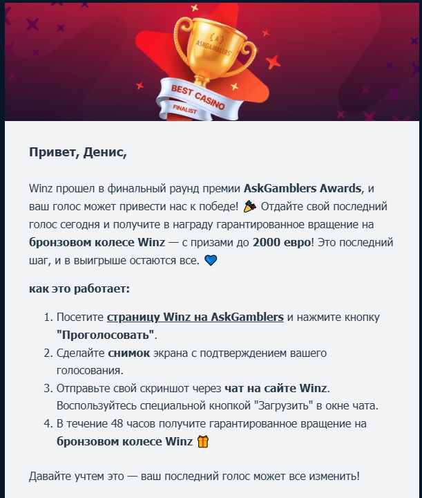 Кому интересно в казино Winz.io дают колесо за голос на Асках, в котором обычно выпадают фриспины, все бонусы там без вагера. Достаточно загрузить скриншот голоса в чат.