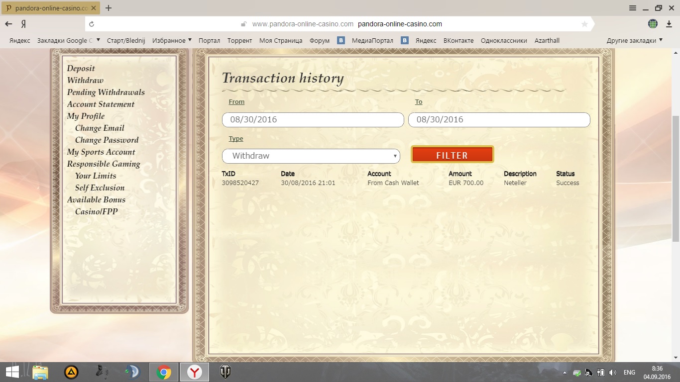 Добавлю конечно же Pandora online casino,вывод с бездепа 700 евро.Документы стандарт-паспорт,коммуналка.Вывод ставил сначала на банковский счет,но благодаря моей ошибке в свифте вывести не смогли.Поставил на нетеллер-через 10 минут деньги упали на кошелек.Отличнейшее казино с лицензионным софтом.Один минус-отсутствие чата,но через почту поддержка быстрая,отзывчивая и культурная.10 из 10