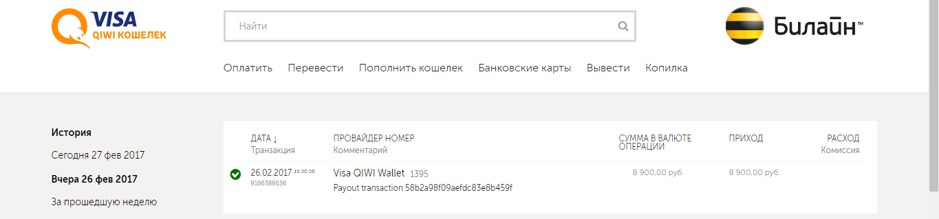 Снятие денег Дата Транзакция Состояние Кредитов 27 Фев 2017 1872530