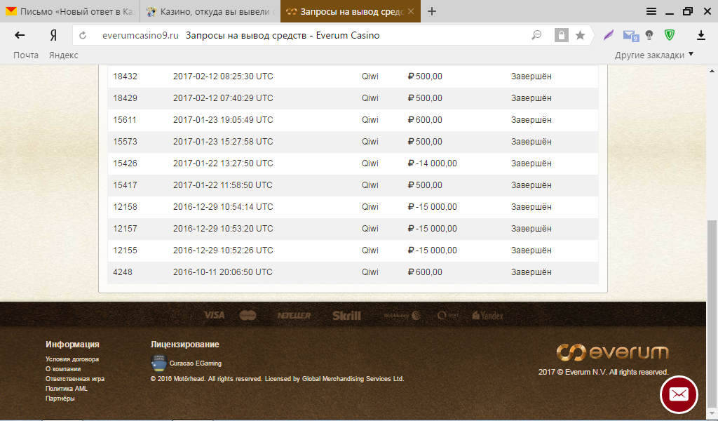 24 февраля этого года решил отмыть фри спины в козявке 🔗 Вообщем с фри спинов насыпал 1400 рублей и побегав по слотам открутил бонус с вагером 40%, в тот же день. Когда на балансе оказались 8922 рублей решил поставить на вывод, поставил на киви и обратился в чат. С помощью поддержки прошёл верификацию номера телефона и паспорта. Они сами предложили затирать номер и серию. Когда через почту отправил им док, то через 10 минут получил такое послания: Мы получили Ваши документы. Для завершения идентификации аккаунта, пришлите, пожалуйста, фото с разворотом паспорта в руке. На фото должны быть видны Вы и присланный паспорт. С уважением,Валентин, администратор казино «Вабанк» Куда деваться, скрипя зубами сфоткался и послал, тоже с затёртыми номерами. 26 февраля отменили выплату и когда спросил в чате сказали что нужен мин деп в моей случая лучше СМС депозит, так как вывод будет на киви. Совершил депозит в 50 рублей, которые с процентами обошлись в 70 рубасиков. Сегодня утром захожу и увидел обработанную заявку и в киви кошелке сумму 8900 рублей. Остался на балансе 75 рублей реалом с одиннадцатью уровнями, куча фри спинами, которых снова постараюсь отмыть. Всем везения хотя бы такого и крупных выигрышей.