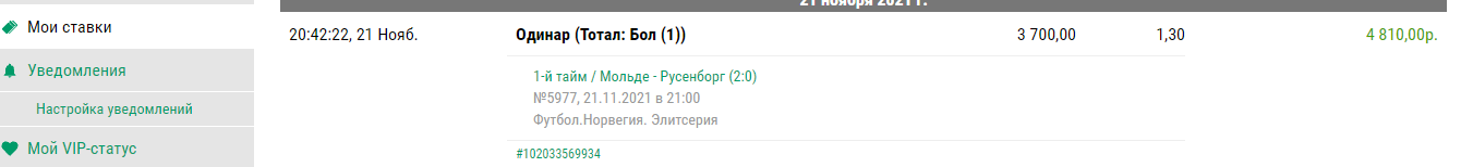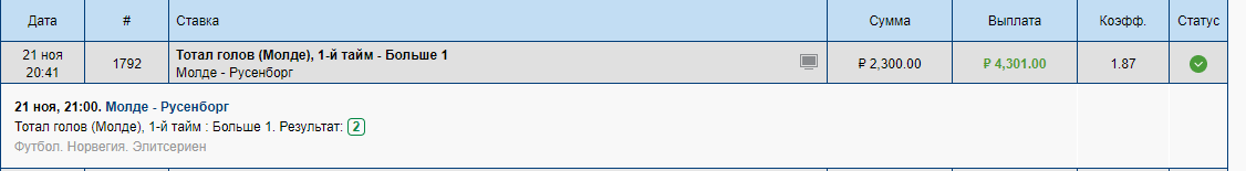 Мольде — Русенборг 1 тайм 2-0 , по второй ставке + 1 110 р
