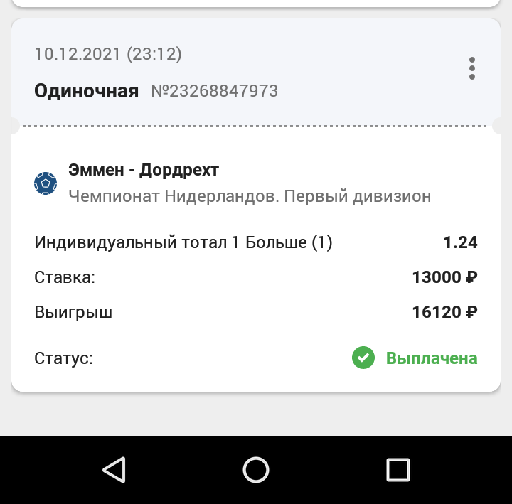 ставил 13 000 р на инд тотал больше 1 эммена , навар составил + 3 120 р
