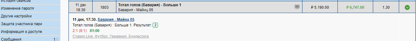 Мини вилка чтоб полюбе в плюсе остаться с матча Германия. Бавария — Майнц , Бавария инд тотал меньше 1.5 , 2.85 , на 1500 р ( счет 1-1 , идет 60 минута матча )